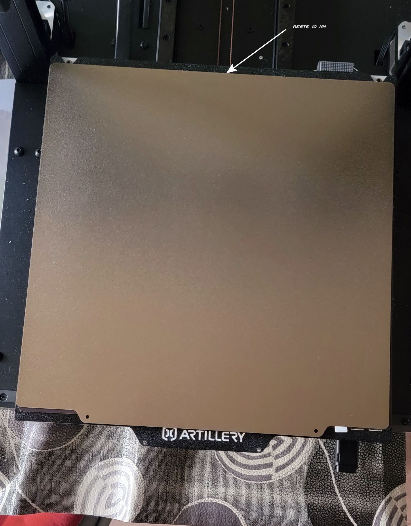 hyoti Posté(e) vendredi à 14:11 Posté(e) vendredi à 14:11 (modifié) @generally Arf pas la bonne taille ! Si ce n'est que les 10 mm derrière, pas de problème, d'après ce que je vois, cette zone 10mm avec deux têtes de vis de calage et les encoches sur le plateau précédent est une zone qui ne sert pas pour l'imprression, en raison déjà des deux vis qui dépassent, cela ne sert qu'à faciliter la pose du plateau calage. (j'ai la même chose sur la creality S1 plus Après tu parles de coller ton plateau !! celui que l'on voit en dessous normalement est une plaque de tôle avec un support magnétique déjà collé sur la partie alu du plateau. Tu retires la tôle en dessous celle marquée Artillery et tu mets la plaque PEI à la place. Modifié (le) vendredi à 14:26 par hyoti ajout