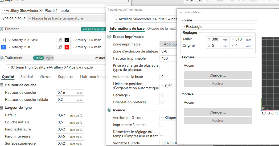 generally Posté(e) il y a 10 heures Auteur Posté(e) il y a 10 heures Est il possible de trouver un gcode pla pour une sw x4 plus s1 pour faire un essai ? Comme je l'ai déjà cité,je suis novice dans orca slicer et je ne maîtrise pas tout. J'avoue quand même que je préfère cura. J'ai changer de slicer pour connaître ce slicer et aussi parce que mon imprimante n'est pas répertorié dans orca