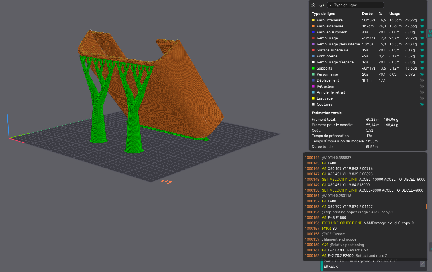 pat30 Posté(e) il y a 8 heures Posté(e) il y a 8 heures (modifié) Quelle température ? (plateau et buse) je pense que tu imprime trop froid, et imprime dans le sens de sa hauteur. Tu aura une meilleure accroche au plateau et tu n'aura pas besoin de supports. Modifié (le) il y a 8 heures par pat30