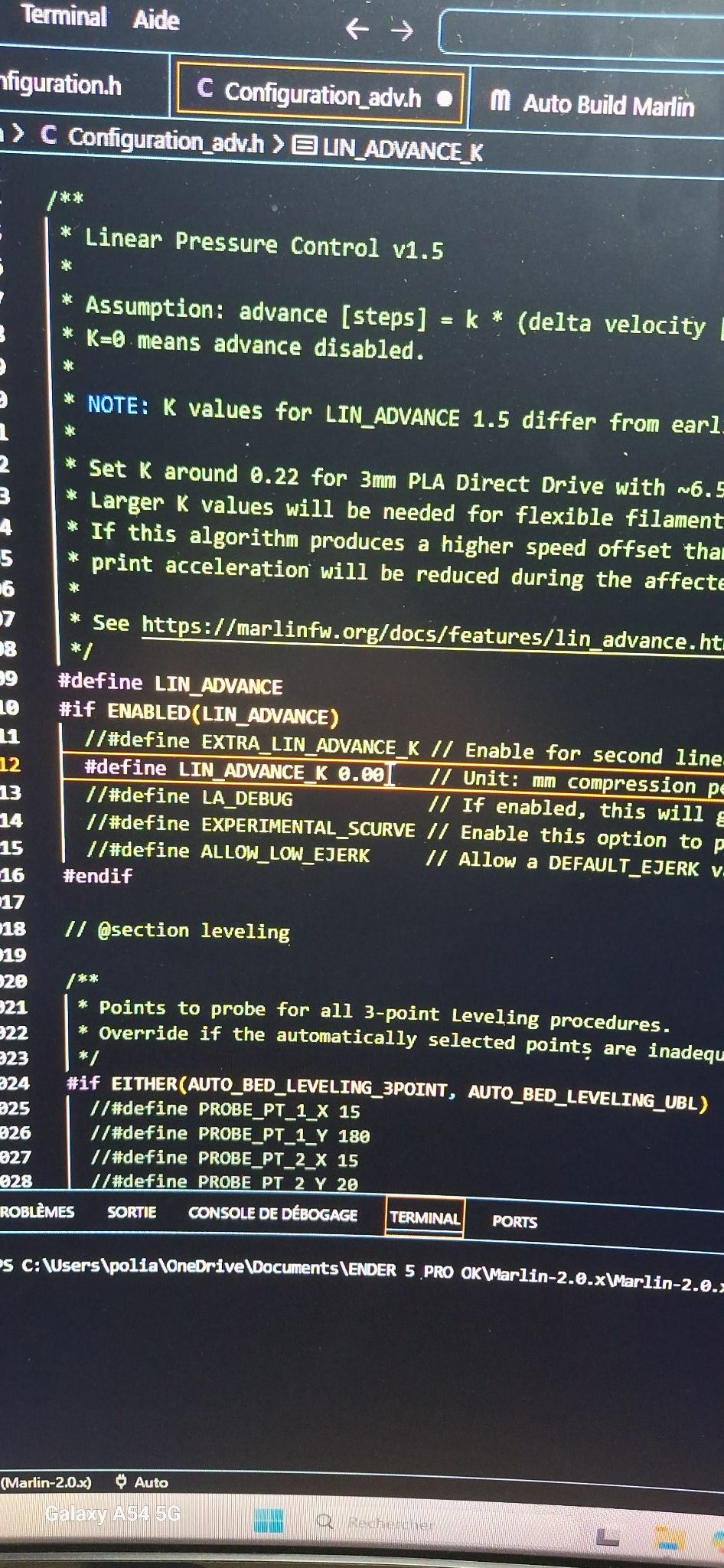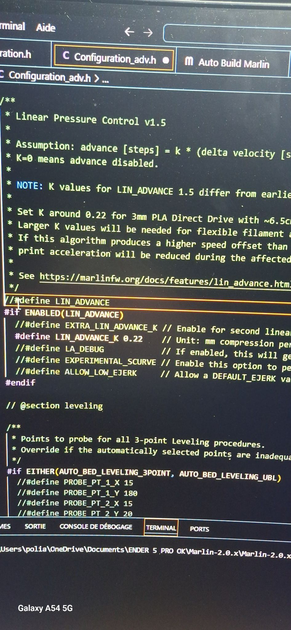 sarsarote Posté(e) il y a 5 heures Posté(e) il y a 5 heures bonjours a tous je vais expliqué mon problème je possède une ender 5 pro sous marlin 2.0.9.7 carte 4.2.2 j'utilise orca slicer. J'ai tout les teste de calibration et de réglage , je suis tombé sur des poste ou il parle du linear advance facteur k , curieux de nature j'ai vérifier sur ponterface après avoir installé marlin n'est pas activé voir photo 1 Puis j'ai activé voir photo 2 ou j'ai mis le facteur K a 0.00 je me demande si j'ai bien décommandé les bonnes lignes car quand je fais le teste avec le facteur k a 0.22 j'ai ce si et quand je le fais avec le facteur k a 0.00 il n'y a rien qui s'imprime , pourquoi j'arrive pas a faire se teste ? bien a vous bonne journée