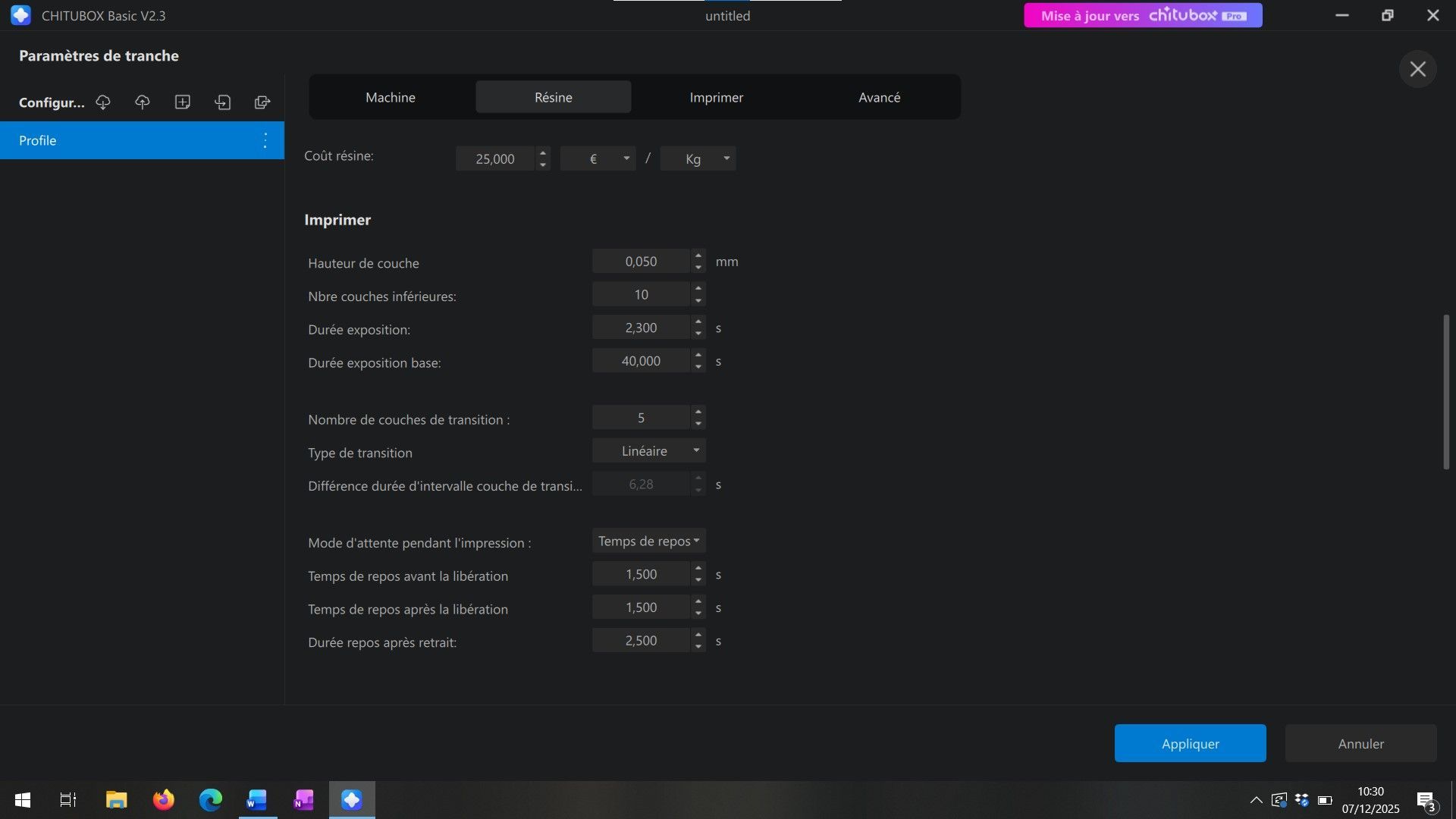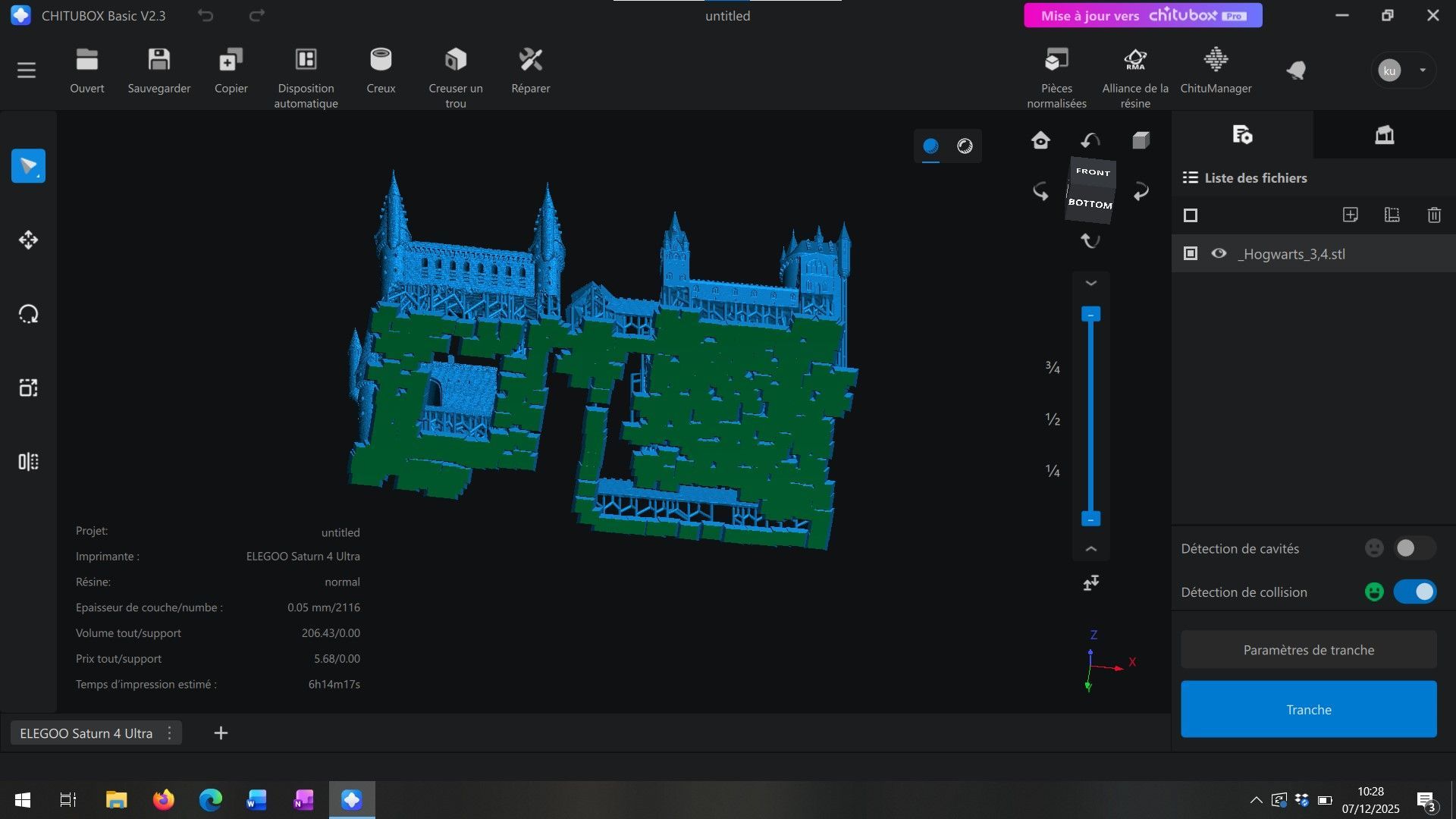 kuriste Posté(e) il y a 14 heures Posté(e) il y a 14 heures Bonjour à la communauté Je viens vers vous pour obtenir conseils et idées. Ma Saturn 4 Ultra n'arrête pas de faire de la M... Mes impressions plantent systématiquement sur le côté gauche du plateau. Soit, le rack est décollé et la pièce sort quand même, soit ça reste au fond du bac. J'avais pensé à un choc thermique du fait des températures hivernales. J'ai le système de chauffe de chez Chitu. D'habitude, il fait bien le taf. Mais bon, je sais que les températures expliquent souvent les échecs. J'ai donc transporté l'imprimante dans une autre salle mieux chauffée, avec un radiateur à proximité, et toujours le Chitusystème. Je vous donne en pièce jointe mes paramètres d'impression. Il y a peut-être un truc qui m'échappe. Il faut que je teste la planéité du plateau. Mais il est récent et il a toujours bien fonctionné depuis que je m'en sers. En gros, c'est un peu vague ! Merci par avance pour le coup de main ! Didier