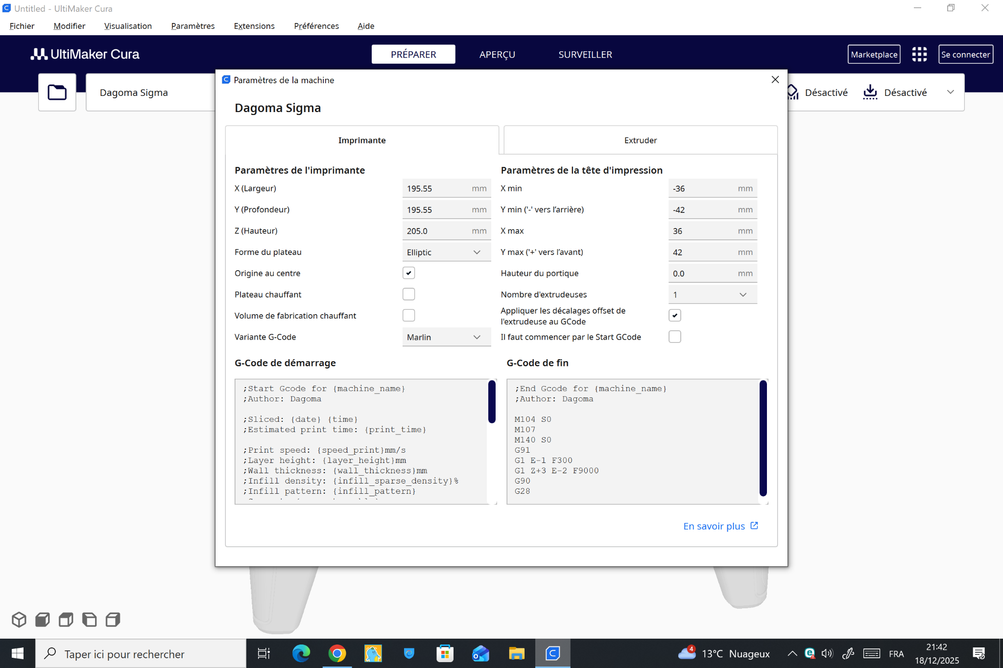 ultramar71 Posté(e) il y a 2 heures Posté(e) il y a 2 heures Bonjour à tous. Je suis novice sur le forum, j'espère que mon sujet est au bon endroit. Je n'ai pas non plus trouvé de réponse à ma question. Avec mon imprimante Sigma de Dagoma, j'utilise jusqu'à présent Cura By Dagoma, qui est un logiciel très bien quand on débute comme moi. Cependant, je souhaite imprimer des pièces qui nécessitent des paramètres qui n'existent pas dans CbD comme les supports en forme d'arbre ou des taux de remplissages supérieurs. C'est pourquoi j'ai installé Ultimaker Cura. J'ai également ajouté dans le logiciel une imprimante Sigma dans la liste déroulante, avec des paramètres déjà enregistrés. Lors d'une impression d'essai, après une ou deux couches, l'imprimante s'est arrêtée et a commencer à trembler/vibrer en faisant un bruit énorme. Impossible à arrêter, j'ai du débrancher l'imprimante. Après quelques recherches, j'ai l'impression qu'il y a un problème dans les paramètres de l'imprimante (G-code de démarrage et G-Code fin) ainsi que peut-être dans les profils d'impression (que je n'avais pas changé). Je ne trouve nul part les bons Gcodes à copier ou autre information qui pourrait m'aider. Auriez-vous des idées et, peut-être, une aide à m'apporter? Je souhaite imprimer la petite presse d'impression "Open Press Project" et je vais avoir besoin de remplissages conséquents... https://openpressproject.com/ Merci d'avance pour votre aide et bonne soirée.