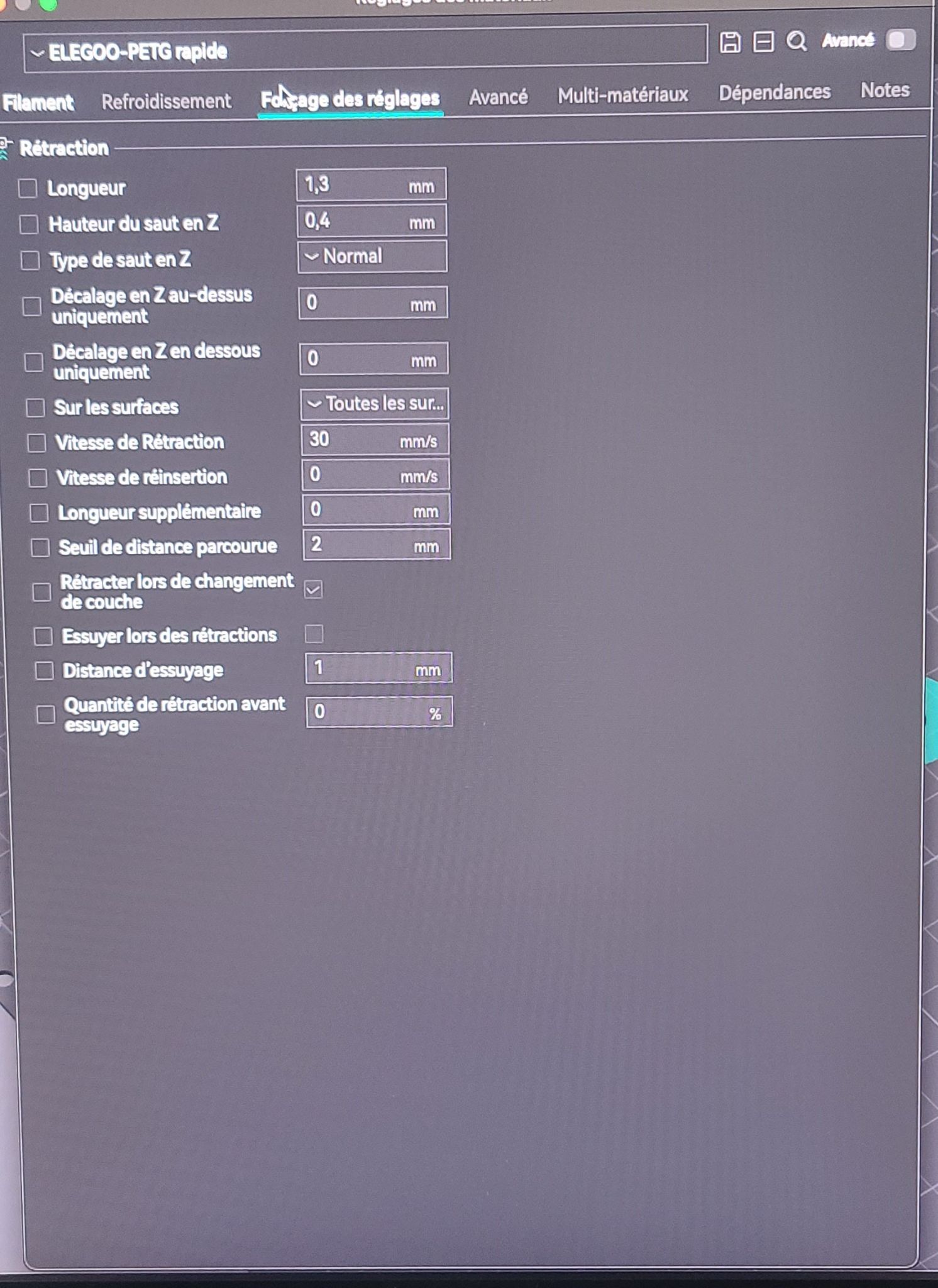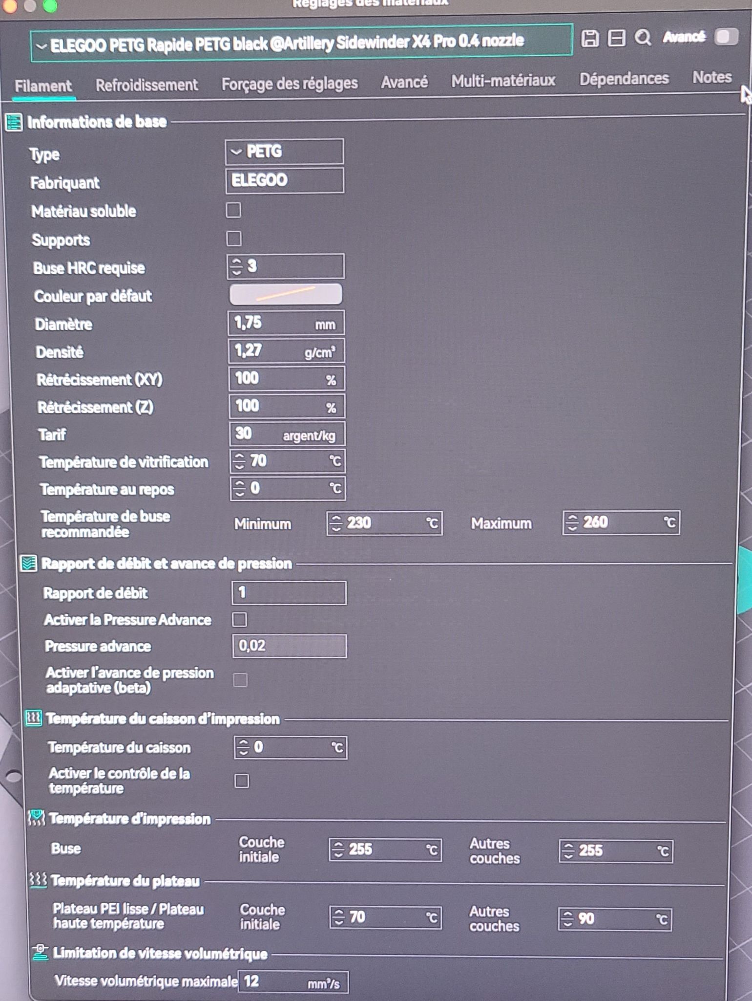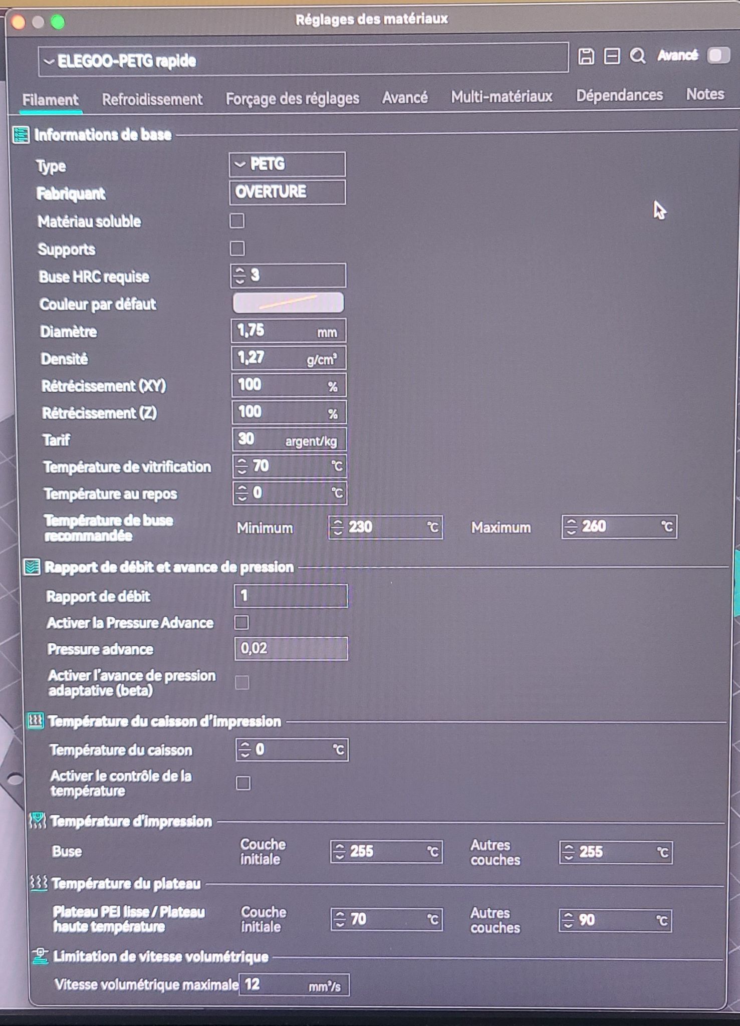 bubus Posté(e) il y a 1 heure Posté(e) il y a 1 heure Hello everybody, Je rencontré de nouveau un problème avec mon impression PETG sur un petit objet. Je constate que le filement ne sort pas de suite lors du trait sur le bord et lors du début d impression au milieu du plateau. En effet, il faut quelques secondes pour que le filement sorte, ce qui sur ma petit impression fait qu'elle ne tiens pas et je rate l impression. J ai fais un essai avec mon pla et le profile pla et la pas de problème. J ai bien un début d impression sur le bord et arrive au milieu l impression se lance immédiatement et s en problème. A quoi cela peut être du ? Reglage dans orca ou dans le profile PETG ? Voici mes profilés PETG et PLA. D'avance merci et passez de bonne fêtes.