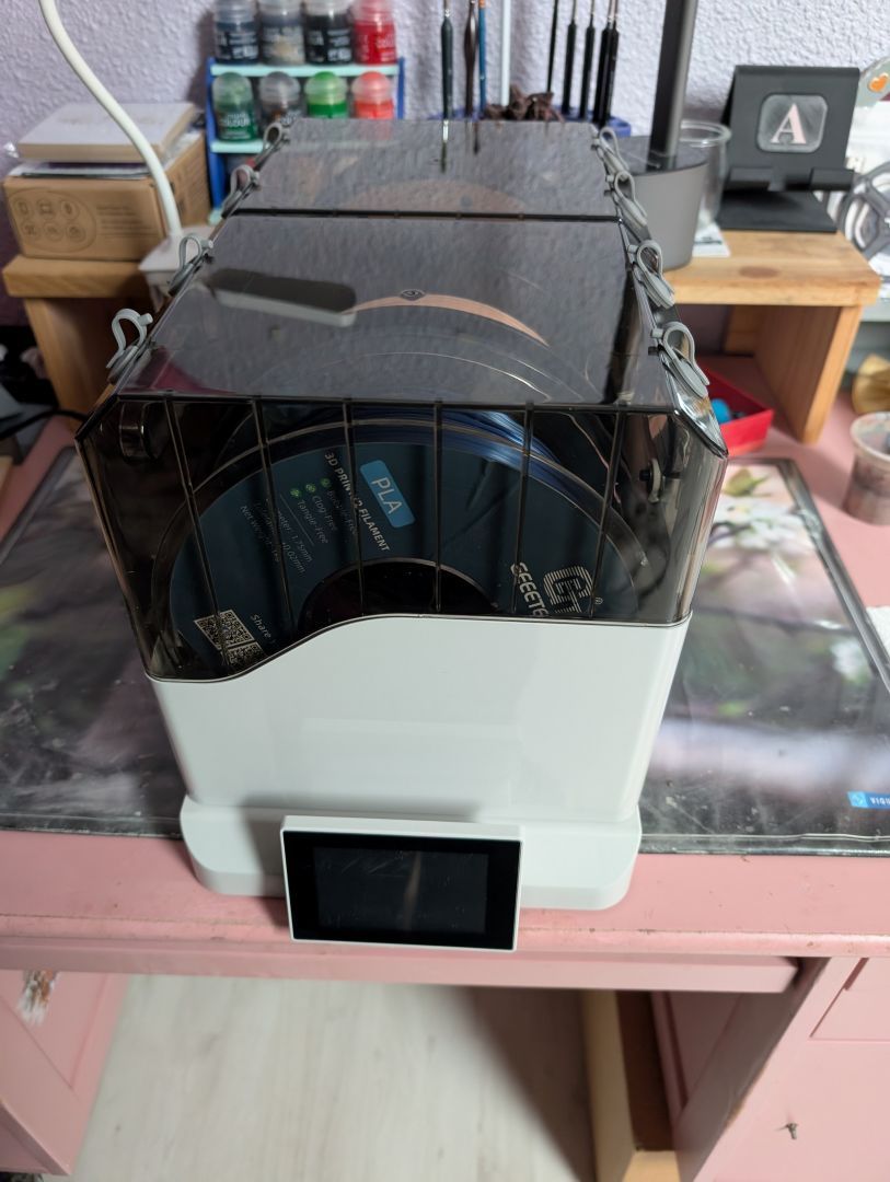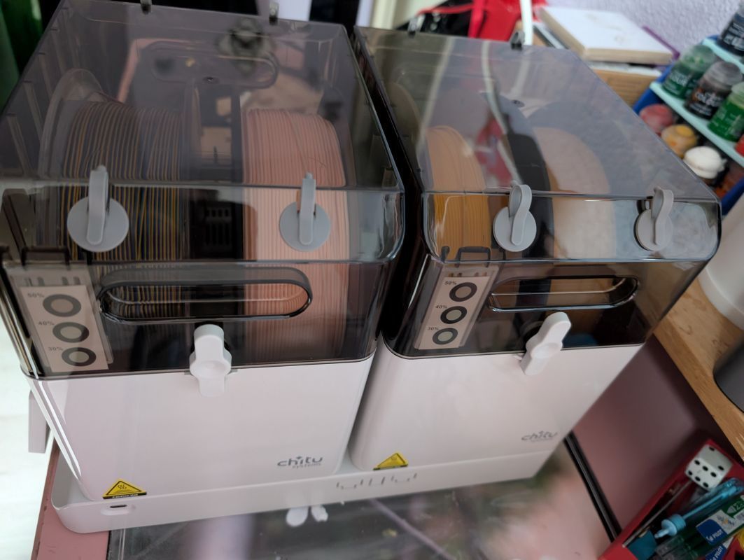 MrMagounet Posté(e) il y a 1 heure Posté(e) il y a 1 heure @Kazaam alors tiens c'est marrant je viens de finir d'écrire l'article de test sur le dryer que j'ai pris hier il sortira d'ici quelques jours sur le blog. Pour ma part j'ai choisi le Chitu Filapartner E1 que j'ai acheter début décembre et reçu juste avant les fêtes, je l'ai eu en promo a 101€ sur leur site mais sinon il est généralement trouvable entre 115 et 130€. Ce dryer ce compose d'une base et de 2 drybox, sont avantages versus la concurrence comme le SunLu S2 il a 2 zone de dryer indépendant comme pour la Space Pi X4 et X4L, l'autre avantage on peut fermer par des plaque magnetique les 2 ouverture sous les box pour les rendre hermetique et conservé ces bobine au sec de façon passive et les placer dans des lieux différent pour alimenter des imprimantes différentes, c'est une des grosse raison de mon choix, et tu peu acheter des drybox supplémentaire pour faire tourner les bobine a sécher et utiliser . Le E1 est adapter au filament PLA, TPU, PETG, PCTG, ABS, ASA, PA (cela demande un peu plus de temps car la limite de 70°C rallonge un peut le temps pour du PA). Sinon comme la dis @JoOj y a le Space Pi X4 qui dry 4 bobine sous 2 zone distinct mais c'est un format mono bloc, sa force par contre il monte jusque 85°c ce qui le rend parfaitement compatible avec le PA et le PC, après c'est nouveau mais Creality a sortie un PI X4L qui a le même boitier que le PI X4, mais avec un ecran et une interface un peu plus simple et une limite a 75°c de chauffe sont avantage il est moins chers que PI X4