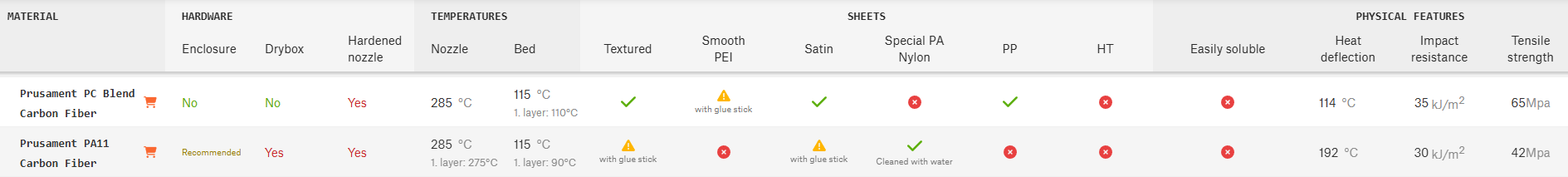 Kachidoki Posté(e) il y a 4 heures Posté(e) il y a 4 heures (modifié) C'est bizarre, si je me réfère à ce tableau, le PA me semble plus compliqué à imprimer : Et je confirme que sur un PEI satiné, même avec de la colle, je n'ai jamais réussi à imprimer correctement du PA12 non chargé en fibres. Aucun soucis en revanche pour imprimer du PC, du PC-ABS et du PC-CF. J'aurais bien voulu tester avec du PA11-CF mais c'est 2.5 fois plus cher que le PC-CF (160€ contre 66€ chez Prusament), et en plus il faut un plateau spécial qui coûte aussi cher qu'une bobine de PC-CF... Modifié (le) il y a 4 heures par PPAC Sur demande de l'auteur du commentaire, déplacement du commentaire, d'un sujet a l'autre, fait 1 1