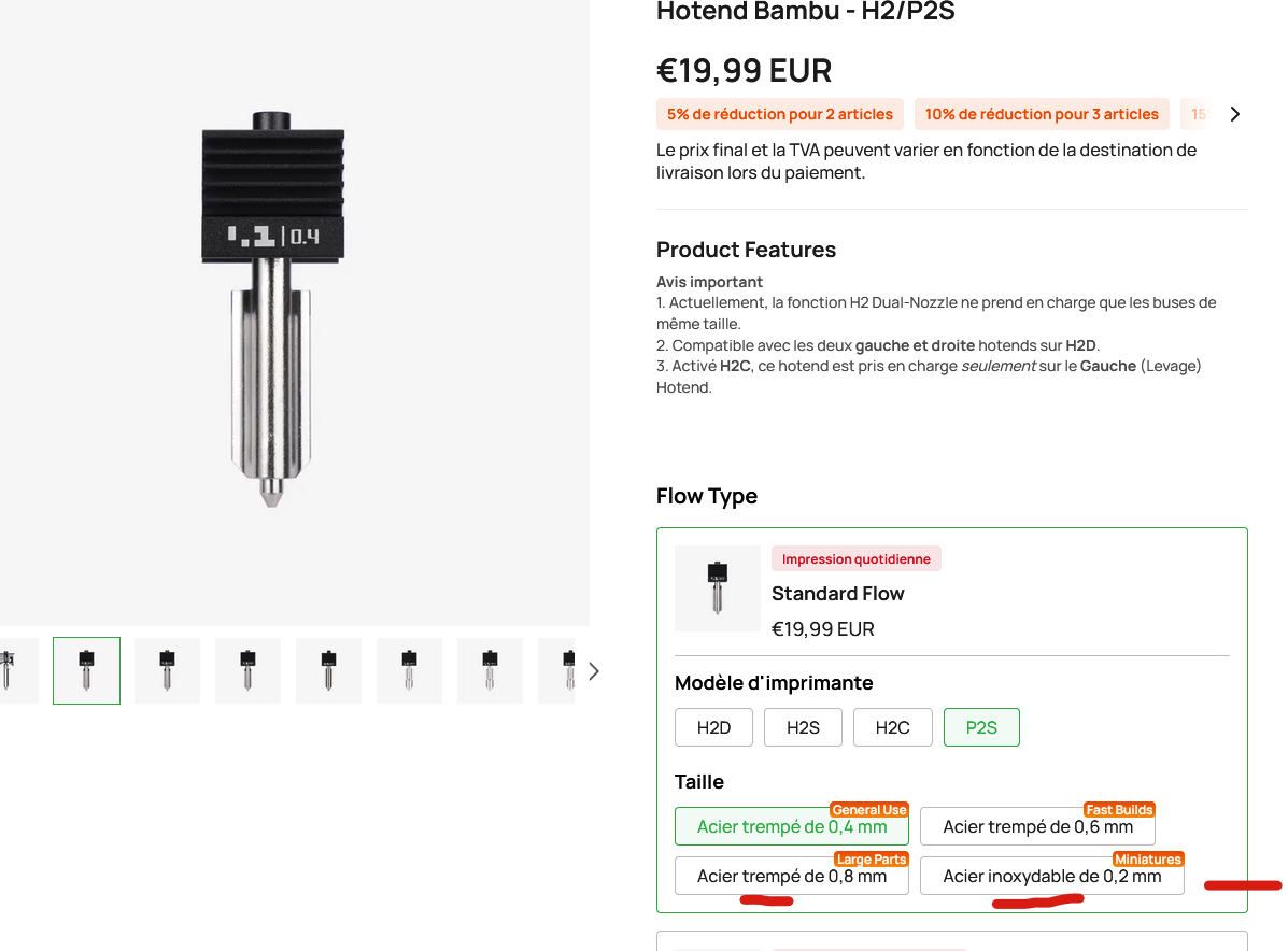 hyoti Posté(e) il y a 22 heures Posté(e) il y a 22 heures Sur la K2 plus l'insert dans la buse est en acier durci (pas inox), il existe des buses pour K2 plus en carbure de silicium Phaetus. exemple Sur le site de Bambulab, il est indiqué pour les buses acier durci ou inox (par exemple pour les 0.2mm) Ils ont des buses avec insert en carbure de tungstène mais c'est bien plus cher !!