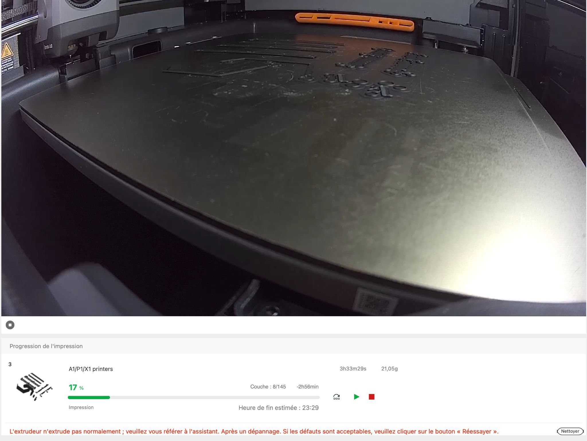 pleinair37 Posté(e) il y a 13 heures Posté(e) il y a 13 heures Bonjour. Savez vous si il y a une contre-indication à imprimer du PLA Matt Noir BambuLab avec une buse de 0,2mm ? J'ai regardé sur la page de vente, mais je n'ai rien vu. Et j'ai ce message qui apparait à la 8ème couche... L'imprimante ne veut rien savoir, elle tente des nettoyages et des recharges du filament, mais rien ne coule à la buse... J'ai déjà imprimé 1 plaque en 0,2mm avec ce filament sans souci... Merci de votre aide...