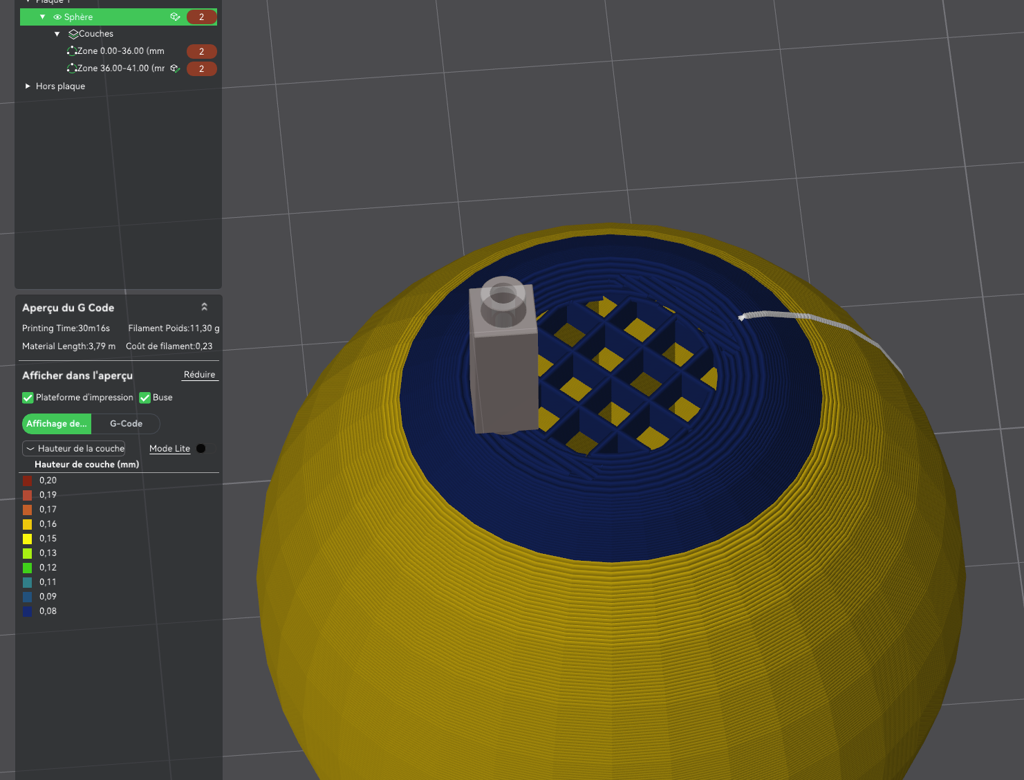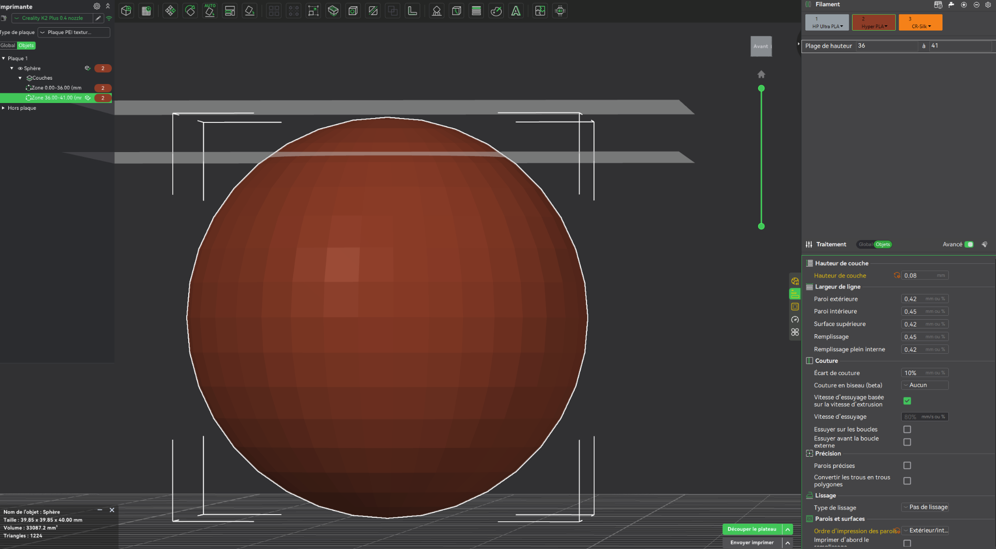 papajds Posté(e) il y a 4 heures Posté(e) il y a 4 heures (modifié) Bonsoir, Sur les sphères , plus on monte , plus la couche doit être réduite. il faut faire des hauteurs de couche variables suivant la hauteur. pareil pour le départ. on démarre avec des couches très fines , pour augmenter jusqu'au centre Modifié (le) il y a 4 heures par papajds