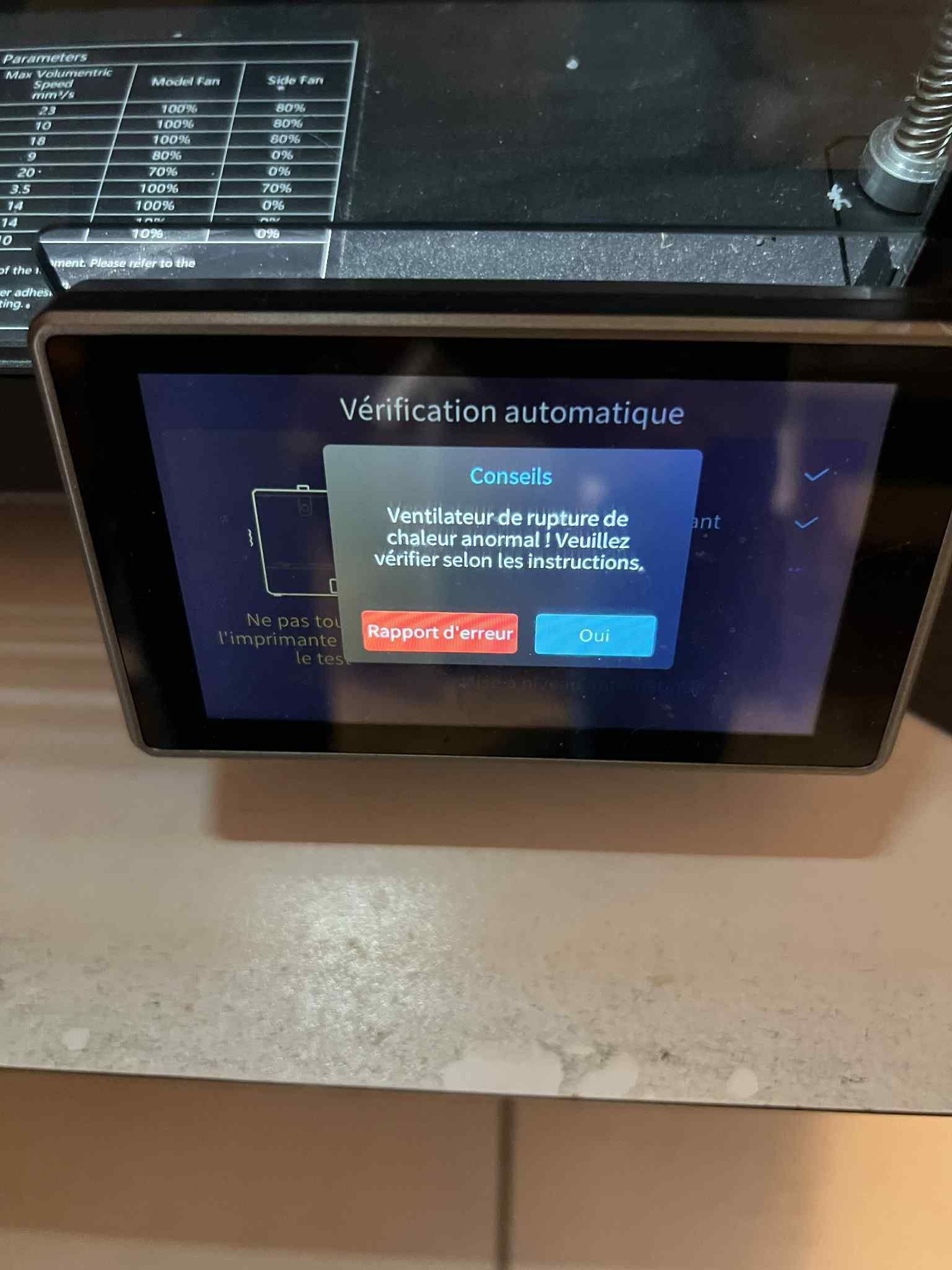 Jean-Charles Faidherbe Posté(e) il y a 1 heure Posté(e) il y a 1 heure Bonjour, J'ai un souci avec une Creality K1, je viens vers vous car j'ai tout essayé de mon côté, le message d'erreur est le suivant : ventilateur de rupture de chaleur, j'ai pourtant remplacé les 2 ventilateur au niveau du capot et de la PCB et j'ai remplacé également la PCB, avez-vous une idée d'où ca pourrait venir? Merci d'avance
