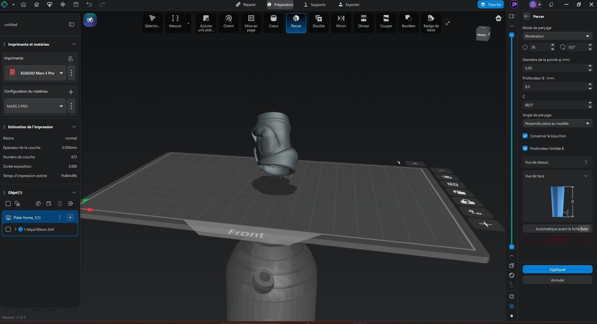 Jeremy Riu Posté(e) il y a 2 heures Auteur Posté(e) il y a 2 heures il y a 2 minutes, PPAC a dit : Là rien ne me choque dans l'orientation mais c'est selon chacun et selon la partie que tu veux sans défaut de surface. Cela dépend du placement des supports et si un évidage avec des trous d'évent pour éviter de créer une ventouse lors de l'impression ou non. C'est pour une première impression et c'est un gobelet a crayon donc je pense que les détails de devant sont les plus importants, après je n'arrive pas a la faire creuse pour evider a part le milieu du pot car quand je regarde les couches elles m'ont l'air pleines et pas creuses.