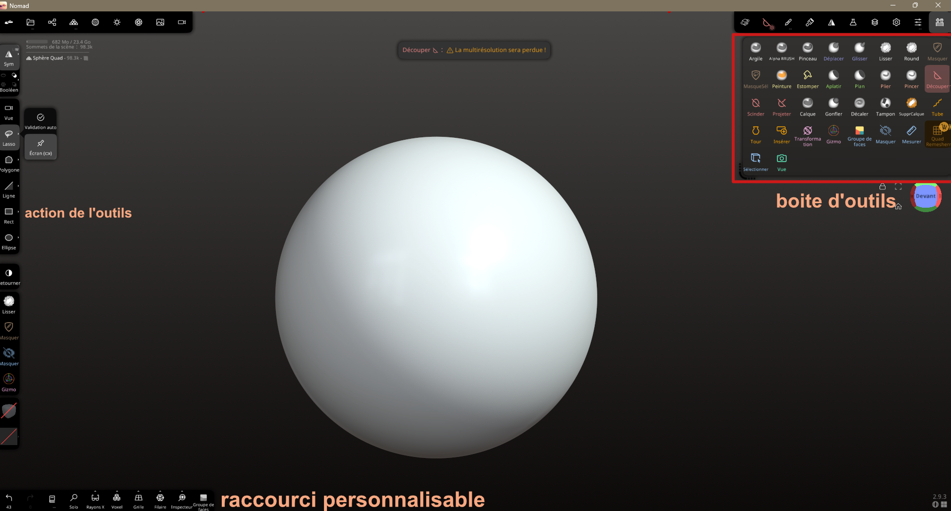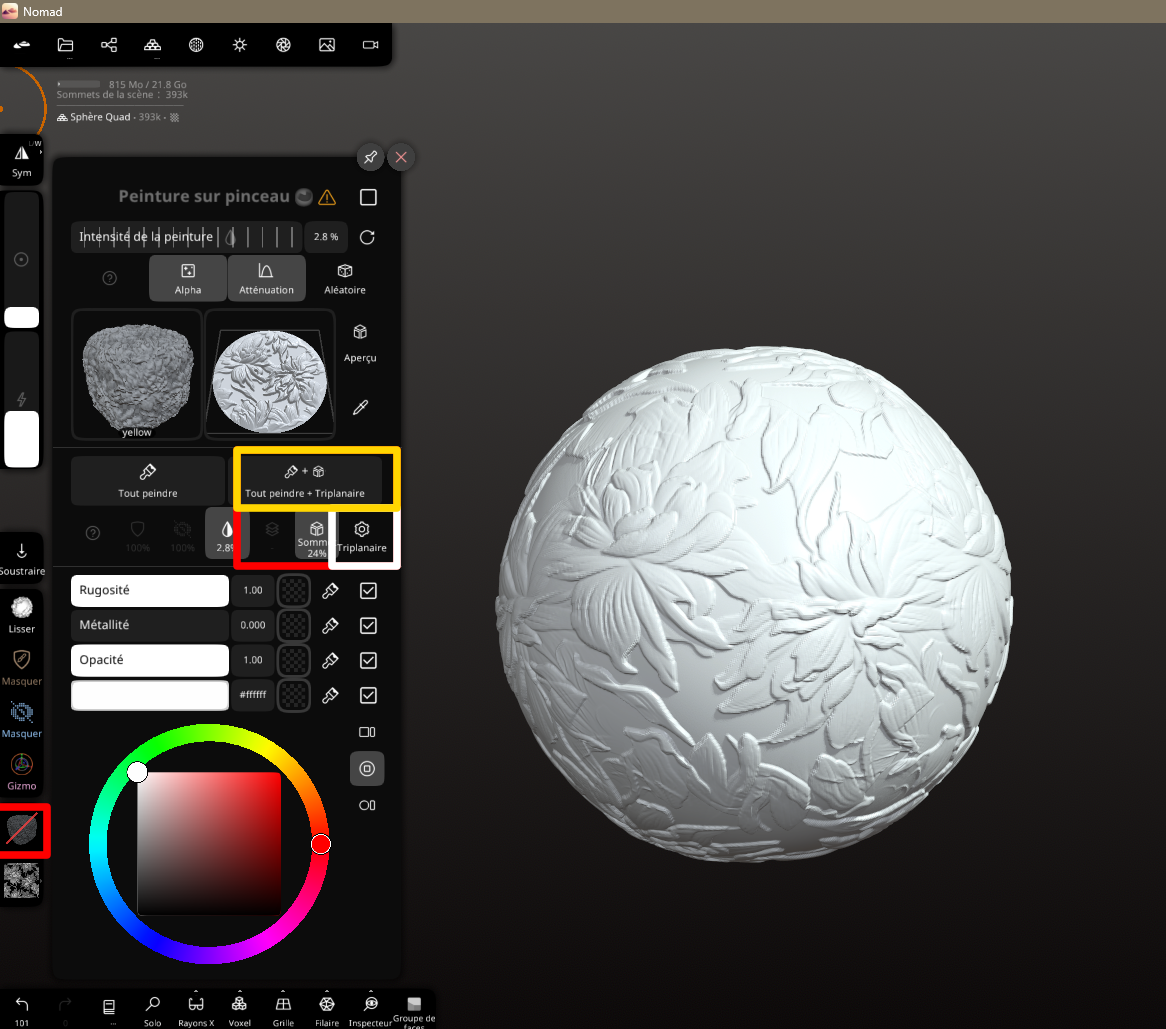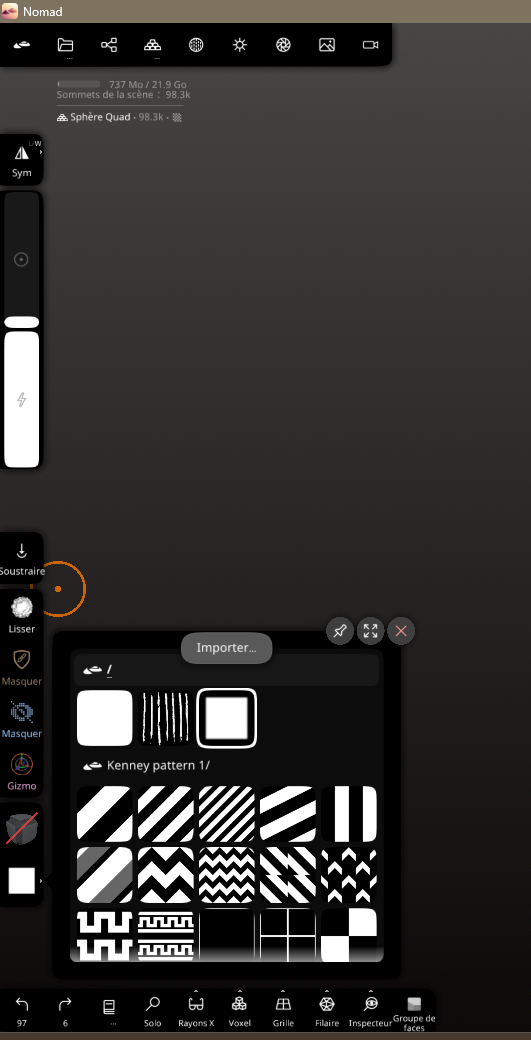 CrashTesteur Posté(e) il y a 9 heures Posté(e) il y a 9 heures Bonjour, Je vous propose un tutoriel sur Nomad Sculpt. C’est un tuto axé sur les techniques. Je ne connais pas tout, mais j’en sais suffisamment pour vous faciliter la vie. Ici, je vous donne la technique et les réglages du stamp pour vous aider à comprendre rapidement certaines actions. Je l’utilise sur Windows avec une tablette XP-Pen Deco 01. 1 – Les bases Nous ne verrons pas toute les bases ici mais elle seront listé certaines sont nécessaires pour le confort d'autre sont obligatoires. Il existe déjà des vidéos sur ces sujets : la plupart ne durent que 3–4 minutes et sont expliquées en détail. Si c’est permis, je mettrai des liens. Voilà tout de même quelques points que vous ne verrez pas forcément. Le mesh-Obligatoire la plage de travaille pour les impression FDM est 450 - 500 voxels, à ce niveaux on utilises l'outils de lissage, c'est ce que je conseille cars vous le verrez dans le cas de certaines texture on récupère beaucoup de détails qui ne seront pas imprimer, au dela de 600 vous avez de plus beaux détails mais l'outils lisser auras plus de mal a combler la topologie de certaine textures ce qui creer des zone irrégulières. 01 – Booléen Comme indiqué : gérez la visibilité des objets et effectuez vos actions. 3