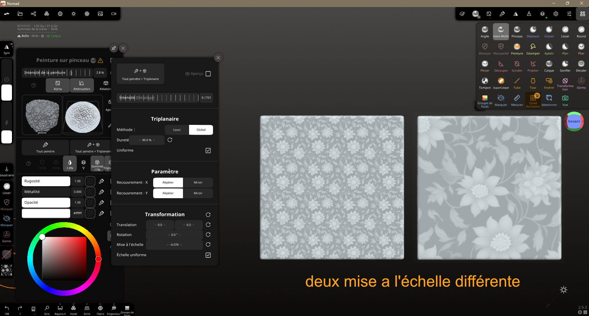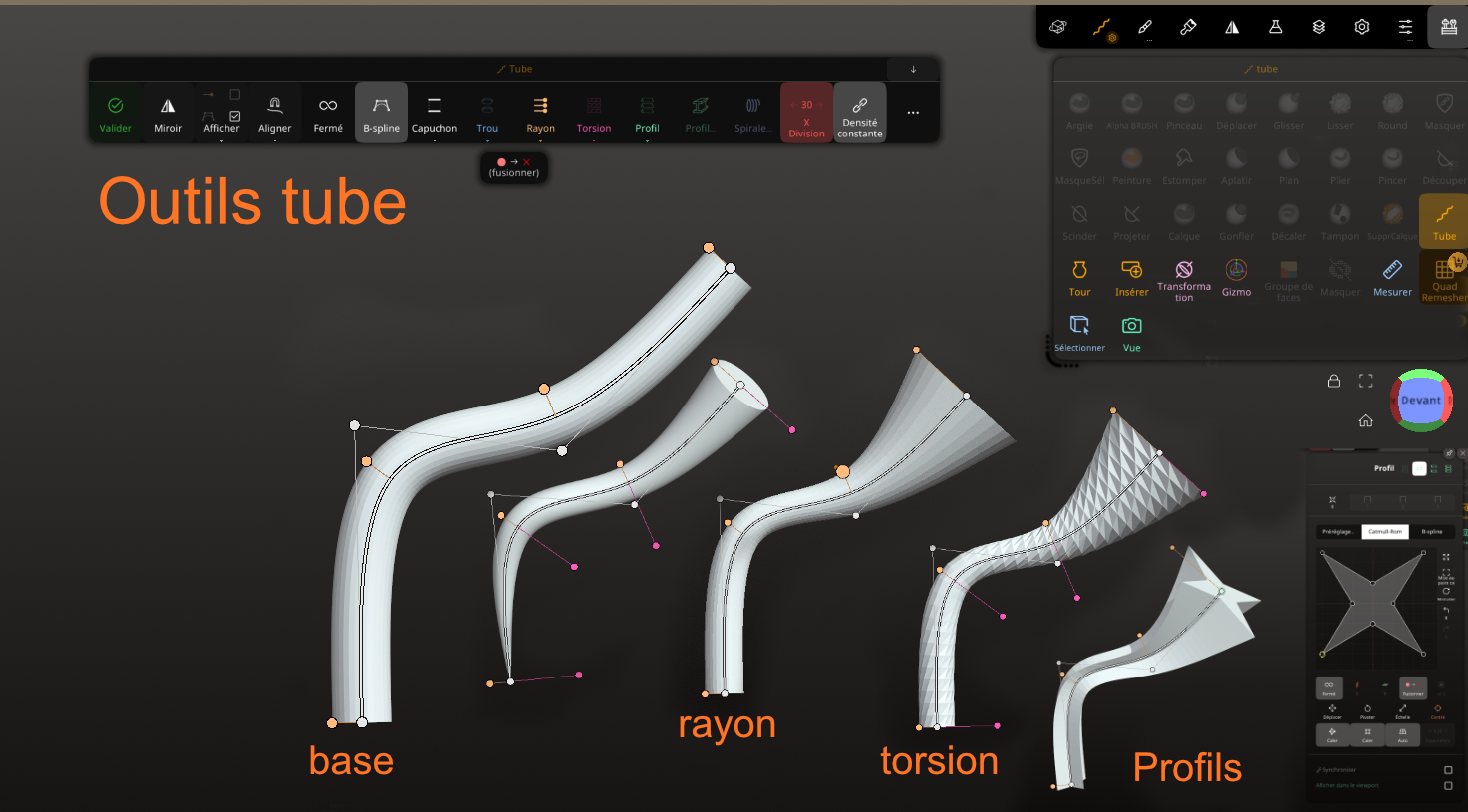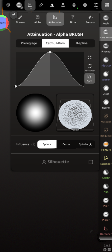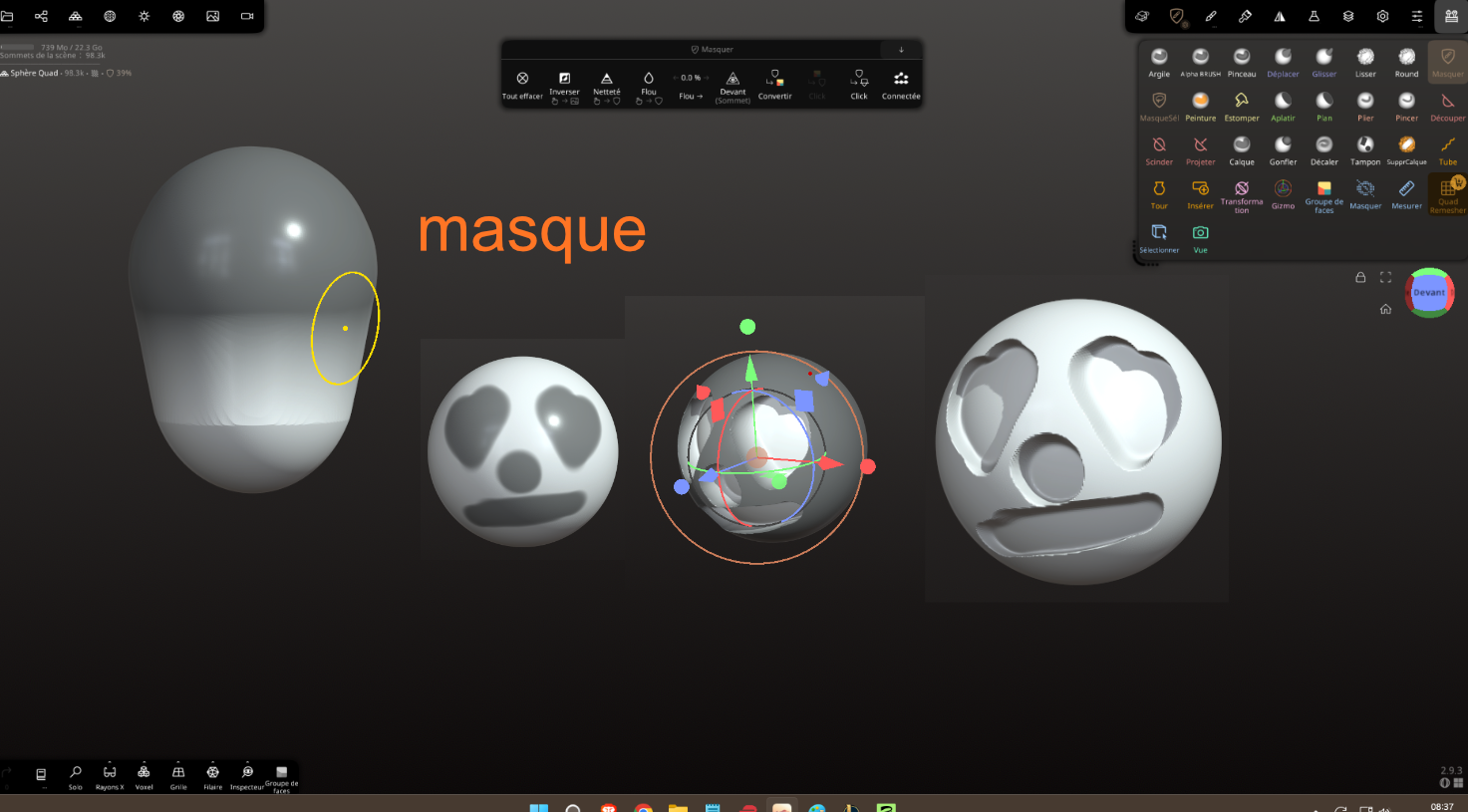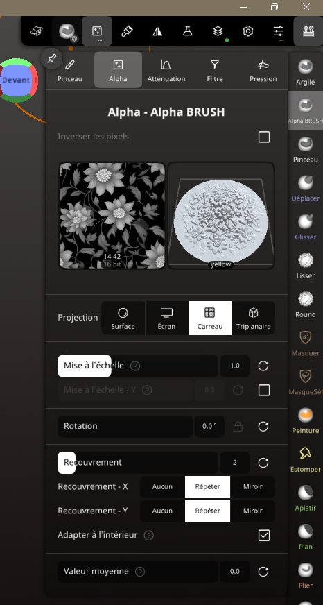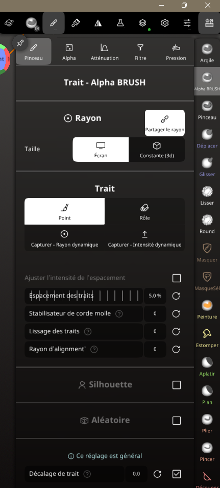CrashTesteur Posté(e) il y a 6 heures Auteur Posté(e) il y a 6 heures (modifié) 04 – L’interface Ce que vous devez savoir : l’interface est presque entièrement personnalisable selon vos besoins. Thème, raccourcis, tout est simple, et c’est ce qui la différencie de Blender. J’ai oublié de dire que le programme est payant : 35 dollars (edit). Le nerf de la bataille se trouve dans les réglages de vos pinceaux. On y reviendra, c’est une partie amusante. Je vous conseille de regarder une vidéo sur les outils déjà proposés. On va s’en servir de base pour la plupart de nos pinceaux personnalisés. 05 – Les outils qui feront la différence MASQUE Celui-ci est un gain de temps extraordinaire. Ce qui en fait un outil puissant, c’est qu’il se combine avec l’outil Gizmo, ce qui permet de faire des formes rapidement. Il n’est pas vraiment intuitif : par exemple, on va souvent utiliser le Gizmo seul pour modifier, et c’est justement cette pratique qu’il faut changer. Pensez tout le temps à comment le masque peut vous aider à faire une forme. Avec l’entraînement, ça va devenir très naturel. Dans l’exemple, je masque une partie. Le mieux est de bien faire la forme que l’on veut. Ensuite, j’ai inversé et j’ai modifié avec un Gizmo pour aller vite, mais vous utiliserez certainement un pinceau vous avez plusieurs axe de modification à partir d'un masque. TUBE Il permet de tracer une courbe. Ce qui est intéressant, c’est qu’on peut gérer la taille des extrémités. Cette image est un montage : on ne peut pas régler autant d’éléments à la fois. C’est un exemple de l’outil Tube. Pour le reste des outils un peu spéciaux, malheureusement j’avoue ne pas beaucoup les utiliser, pour le moment je ne proposerai pas d’exemples. J’espère que vous y apporterez votre contribution. 06 – Les Alpha, depthmap, textures, appelez-les comme vous voulez Pour sélectionner une texture, il faut sélectionner un pinceau, puis cliquer sur la case blanche. Vous pouvez importer vos textures ici. Cliquez sur Triplanaire → réglez à votre convenance → Tout peindre + Triplanaire. L’option Tout peindre seule vous permet d’appliquer uniquement une peinture, Triplanaire uniquement la texture. Avec cette technique simple, on peut appliquer une texture sur tout un objet. Bientôt, vous saurez comment appliquer une texture de manière non destructive et la travailler sur un objet avec des filtres : flou → gonfler la texture → ou jouer sur les couleurs que vous avez appliquées. On passe aux textures par pinceau. Je vous montre rapidement, mais pour les réglages, ça se passe plus bas. NON DESTRUCTIF – LA BASE DE LA RAPIDITÉ Maintenant qu’on a la base du travail, il manque encore quelques outils que j’aurais dû présenter, comme la matrice, mais j’éditerai plus tard. On va passer aux réglages et à la base du travail rapide. Quand j’ai commencé, j’ai perdu beaucoup de temps en appliquant mes modifications de façon destructive. Voilà, c’est fait. Vous pouvez appliquer vos modifications, textures et peintures, puis revenir dessus, supprimer / afficher / cacher plusieurs textures. Maintenant, regardez l’icône fiole d’expérience. On clique dessus et on peut appliquer des réglages globaux, par exemple pour gonfler une texture (très utile pour augmenter le relief des textures knitted) ou pour lisser globalement. Les pinceaux Les pinceaux sont très bien comme ils sont, mais pour certaines actions, on veut personnaliser. On peut aussi créer des conditions pour qu’un pinceau de lissage crée un congé. Ce n’est pas très précis, mais bien souvent, pour faire des figurines, c’est top, notamment pour les doigts. On lisse les bords sans lisser la structure non voulue. On fait ça globalement, sans perdre de temps. Il existe plein d’autres trucs et astuces comme ça. Je vous partage mon pinceau pour les textures. J’ai un peu galéré au début à les régler correctement. Ce texte vient de ChatGPT, je pense que je l’utiliserai pour faire un tuto plus clair et plus complet. Je vérifierai chaque sortie. Alpha Définit la texture utilisée par le pinceau. Alpha : motif appliqué (relief ou creux). Projection : Surface : suit la surface (idéal sculpture). Écran : projection caméra (tampon). Carreau : répétition en motif (tiling). Triplanaire : évite les étirements sur formes complexes. Mise à l’échelle / Rotation : taille et orientation de l’alpha. Recouvrement (X / Y) : répétition ou miroir du motif. Adapter à l’intérieur : garde l’alpha contenu dans la zone. Valeur moyenne : équilibre creux / relief. Sert à sculpter des détails répétitifs ou organiques. Trait Contrôle le comportement du pinceau pendant le tracé. Rayon : Écran : taille fixe à l’écran. Constante (3D) : taille réelle dans l’espace. Trait : Point : tampon par pression. Rôle : trait continu. Espacement des traits : densité du motif. Stabilisation / Lissage : traits plus propres. Rayon d’alignement : aide à suivre une direction. Sert à maîtriser la régularité et la précision du geste. Atténuation Gère la transition du pinceau (bord → centre). Courbe (Catmull-Rom / B-spline) : dureté ou douceur. Influence : Sphère : diffusion douce. Cercle : bord plus net. Cylindre : profondeur uniforme. Sym : symétrie de la courbe. Sert à éviter les bords trop durs ou trop mous. Filtre Détermine où et comment le pinceau agit. Accumuler les traits : empile les passes. Topologie dynamique : autorise le remeshing. Topologie connectée : évite les débordements. Protéger la zone : Masque Groupe de faces Échantillonnage de zone : Normal Position Masquage par profondeur : Limite l’effet selon la hauteur (Z). Sert à contrôler précisément les zones affectées. Modifié (le) il y a 2 heures par CrashTesteur