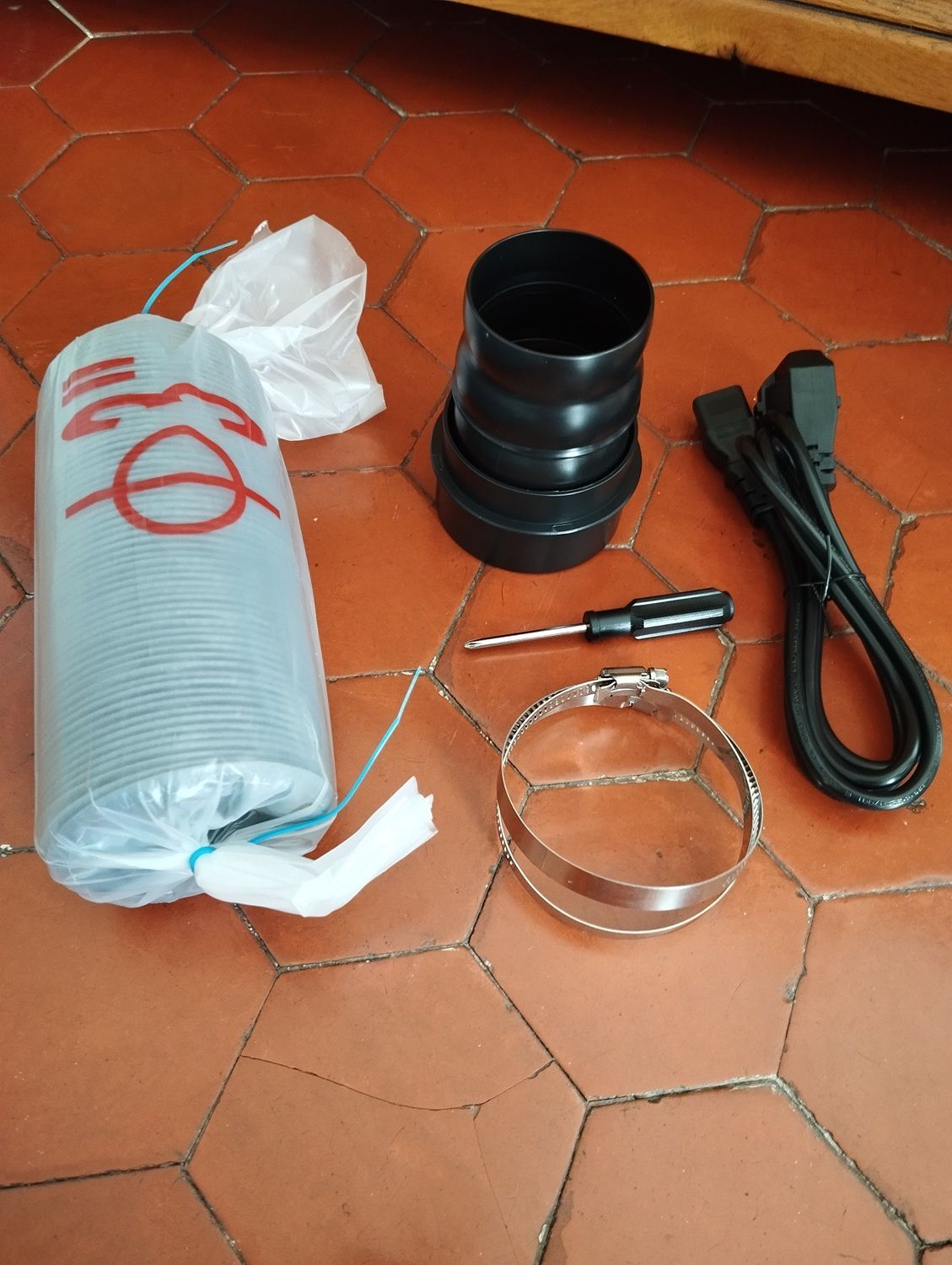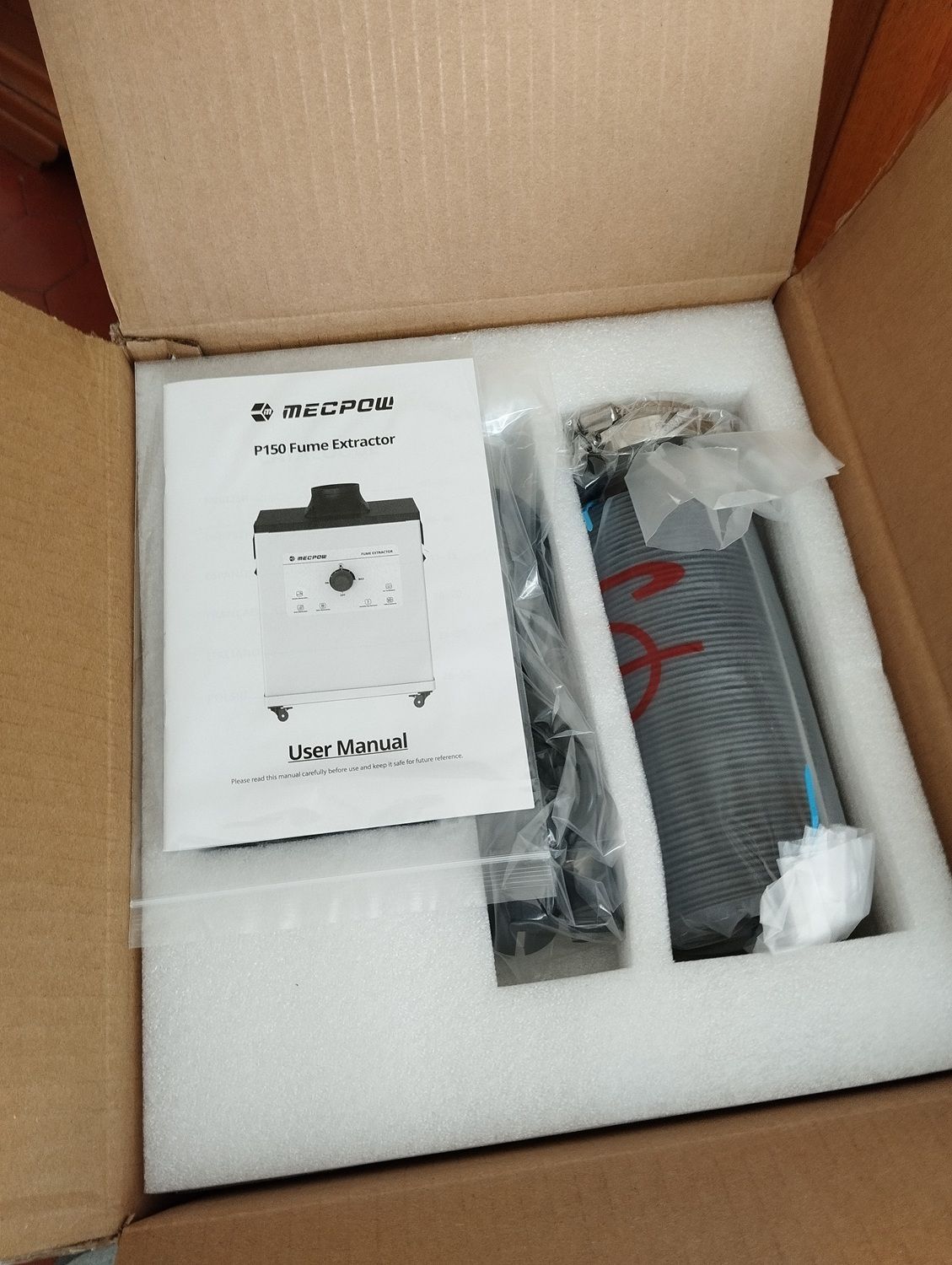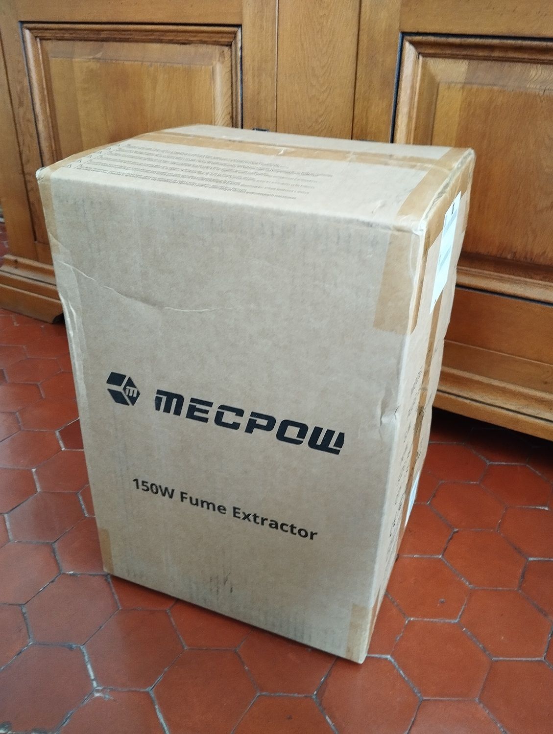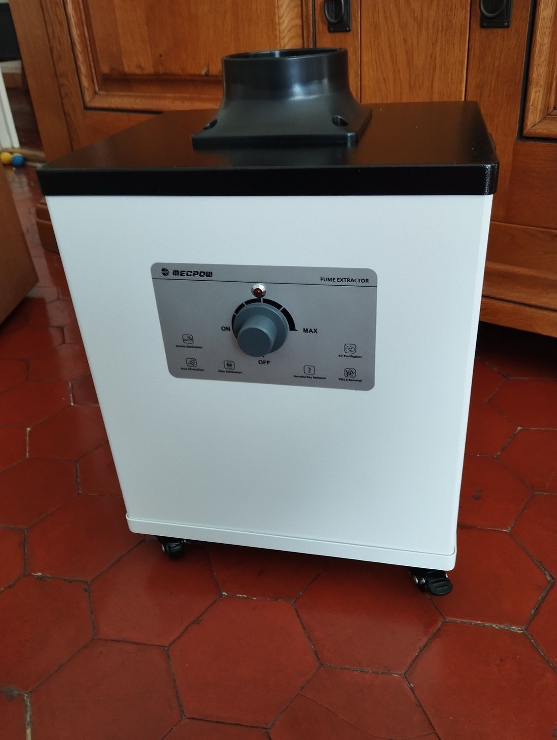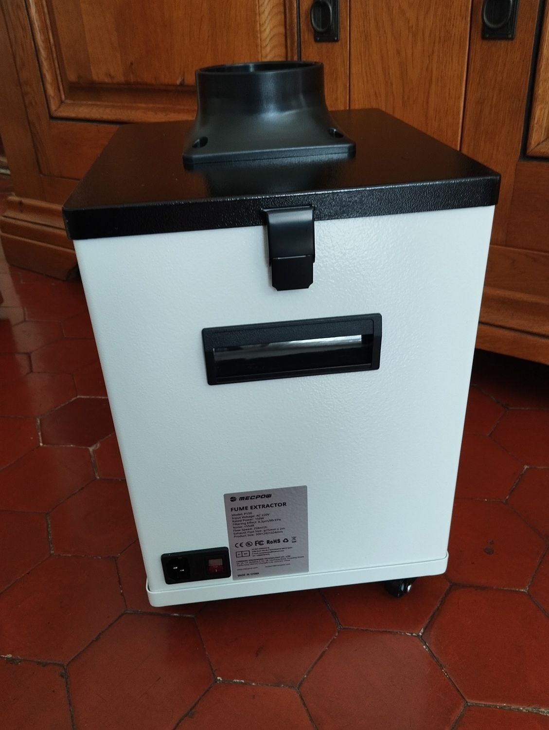 pascal_lb Posté(e) il y a 8 heures Posté(e) il y a 8 heures (modifié) Jusqu'ici quand j'utilisais mon graveur laser je le plaçais dans ma cuisine et je me servais de ma hotte aspirante pour évacuer les fumées c'était très efficace mais moyennement pratique, dernièrement j'ai changé le graveur Elegoo Phecda que j'avais pour un Creality Falcon A1 mais celui ci est nettement plus lourd et comme les vertèbres des retraités doivent être ménagées, j'ai décidé de placer le Falcon dans une autre pièce pour ne plus le bouger mais là pas d'évacuation de fumée, j'ai donc décidé d'acheter un extracteur de fumées et mon choix c'est porté sur le Mecpow P150 que j'ai commandé chez Geekbuying. Pourquoi ce modèle ? principalement pour son prix, actuellement à 219 € il rentrait dans mon budget, ensuite pour sa puissance de 150 w et son volume d'aspiration de 258 m3/h, son efficacité de filtration et de purification de 99,97 % et pour finir notre ami @fran6p en possédant un ma confirmer son efficacité. Le Mecpow P150, il fait quand même 9.7 kg avec les filtres, toute la boite est en métal d'où le poids, c'est du solide et on sent la qualité, il est monté sur roulette pour un déplacement plus facile et 2 de ces roulettes sont verrouillables et le dessus se démonte facilement par 2 manettes pour pouvoir accéder aux filtres. Réception du colis de 12.4 kg et de 360 x 315 x 520, livraison par DPD en 5 jours depuis la Pologne. Tout est bien protégé par de la mousse et le carton est bien épais, il est livré avec une documentation en plusieurs langues dont le français, à l'ouverture on distingue les accessoires En dessous encore une couche de mousse Il est protégé également par un sac en plastique, pour sortir le Mecpow P150 ou ensuite pour le porter il est équipé de deux poignées Le voilà sorti du carton, sur le devant le bouton de réglage de la puissance Sur le coté on voit une des poignées ainsi que la prise d'alimentation avec fusible et le bouton de mise ne marche Il est livré avec 4 préfiltres de rechange Les accessoires, le câble d'alimentation, un tournevis, 2 colliers de serrage, le tuyau flexible et un adaptateur pour le tuyau Le gros filtre avec au dessus le préfiltre, les 3 filtres sont dans un support en carton En dessous le filtre HEPA Et pour finir le filtre à charbon actif J'ai pesé le filtre à charbon et vu le poids j'en conclus qu'il doit y avoir environ 1 kilo de charbon actif Vue du ventilateur Modifié (le) il y a 5 heures par pascal_lb 4
