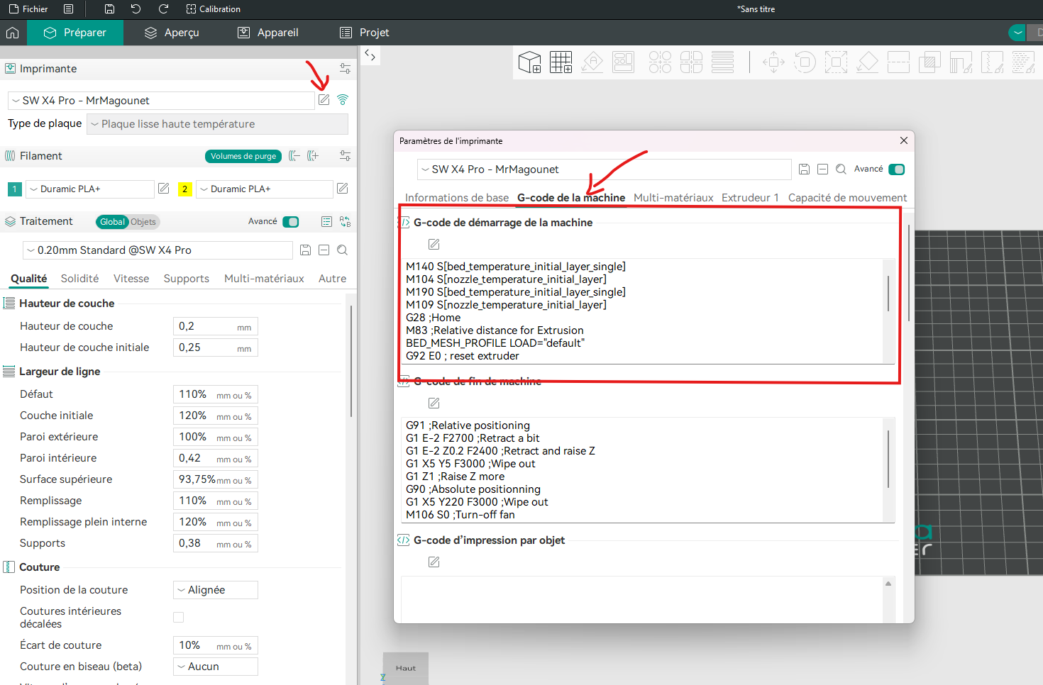 MrMagounet Posté(e) mardi à 10:59 Posté(e) mardi à 10:59 Salut alors oui le Rapide PETG permet d'imprimer plus vite après j'essayerais pas a 500mm/s y a que l'ABS que je ferais a des vitesses si importante mais en tous cas a 250-300mm/s sa passe pas de soucis, en tous cas avec ceux que j'utilise. Pour ton etat de surface faudra possiblement ajuste ton débit, je regarderais ton Gcode pour avoir une idée, mais le start Gcode est présent dans ton trancheur sous Orca c'est dans le configuration de la machine y a un onglet Gcode