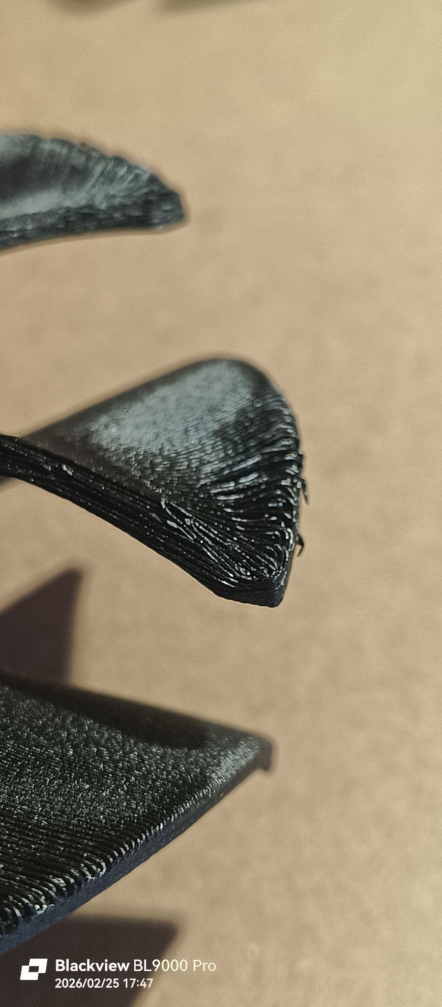 JoOj Posté(e) il y a 1 heure Posté(e) il y a 1 heure faire une tour de température en calibration pour trouver la température d'impression idéale S'assurer que tu as bien passé le filament au séchage (environ 8h), sans compter sur l'affichage de l'humidité de ton dryer envoie nous des photos plus larges, qu'on comprenne dans quel sens tu as imprimé, qu'on sache si la zone avec les picots est un surplomb mal géré ou une mauvaise gestion des supports. A vue de nez, il faut probablement que tu diminue un chouilla l'espace entre les supports et la pièce, mais je te dis ca un peu au pif, on a pas assez d'info pour te dépanner.