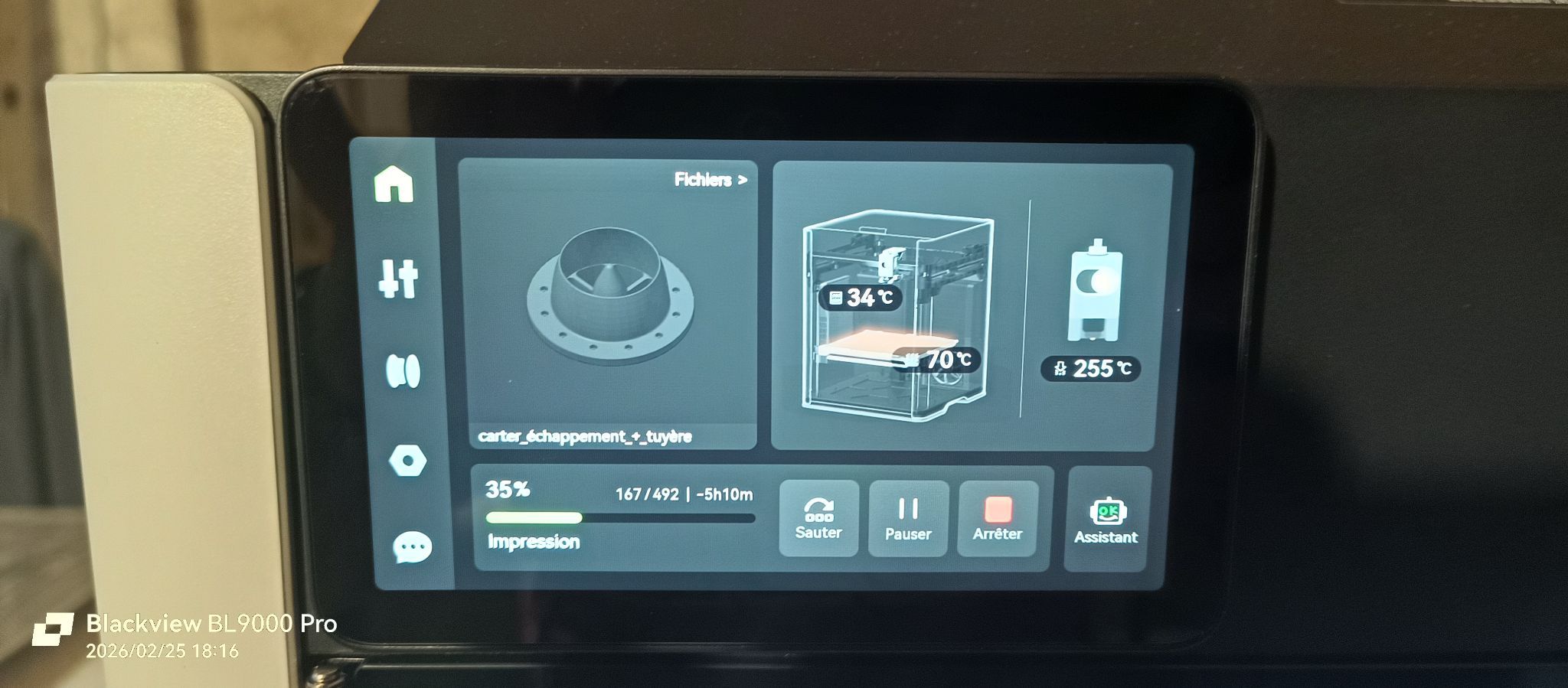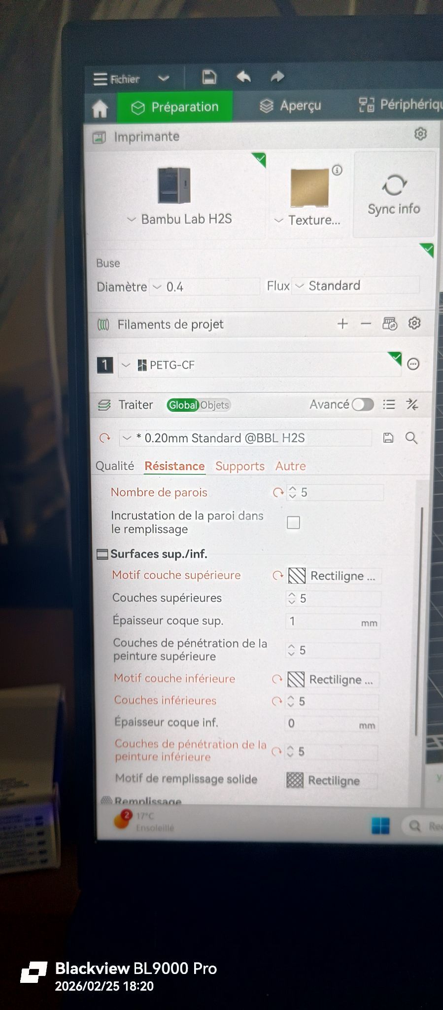 jbg36200 Posté(e) il y a 1 heure Auteur Posté(e) il y a 1 heure il y a 7 minutes, JoOj a dit : Humidité à 12%, c'est probablement dans l'AMS ? Ca veut pas forcément dire que le filament est sec. Pour les photos, tu peux prendre un peu plus de recul ? Là dans l'absolu on a une belle impression avec des surplombs qui semblent pas ouf (y avait des supports ?) mais si ca se trouve c'est même pas des surplombs Quant à la température d'impression, il faudrait probablement que tu puisse faire une tour de température pour faire des essais, car en effet, 270 ca semble bien au delà de la plage habituelle. Pour l'encrassement de la buse : le PETG CF est un filament chargé, il est souvent recommandé d'utiliser des buses de 0,6 (même si certaines impression passeront bien en 0,4) Edit : J'ai vu ta photo entre temps. Si tu l'as passé au séchage, pas de raison que ça soit un problème d'humidité. Mais idem : l'humidité affichée, c'est celle de l'air ambiant dans le sécheur, pas celle du filament qui est de dans. ok je note. la bobine sèche en continu depuis plus de 24h, la j'ai réduit à 255° la buse