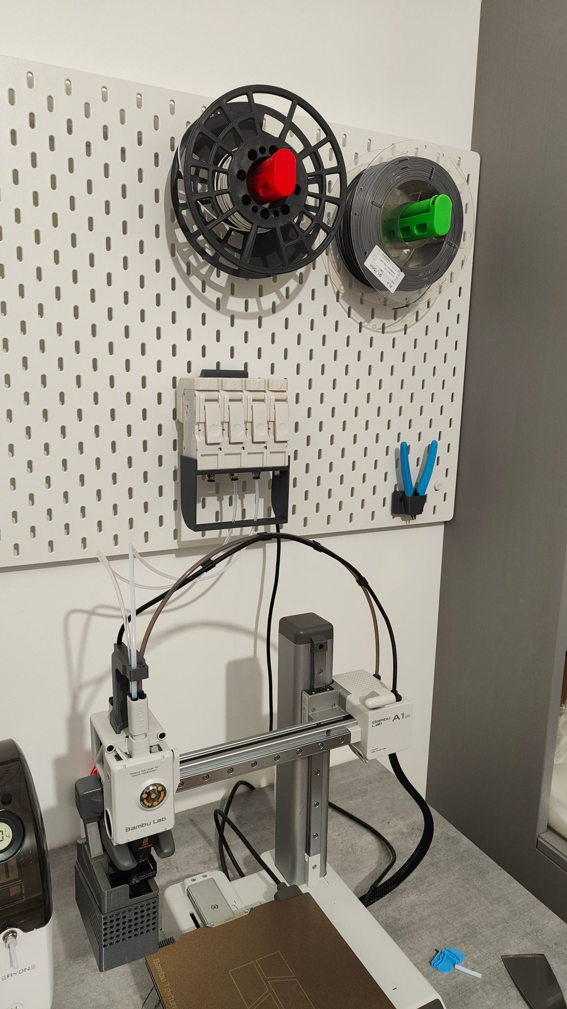 aifol Posté(e) il y a 2 heures Posté(e) il y a 2 heures (modifié) Bonjour à tous, ça fait un petit moment qu'existe le BMCU, un AMS Open source mais quand je m'y était intéressé il était difficilement disponible. Je m'y suis re-intéressé dernièrement, largement disponible sur nos sites de vente chinois préférés entre 70 et 80€ monté. C'est un peu moins cher en kit et il existe quelques variantes. Il agit comme un AMS-Lite mais sans support de filament. On trouve 2 milliards de possibilités d'intégration, de supports, de configurations à la faux AMS-lite etc. C'est compact, j'aime bien son look et après mes quelques tests ça marche très bien. Je ne compte pas imprimer des pièces multicouleurs complexes, mais rien que pour charger/décharger du filament c'est impeccable. On met son/ses filament(s )dans ma machine, on choisi sa ou ses couleurs et on ne touche plus à rien. Fini de devoir attendre la couche X devant la machine pour changer de couleurs, de pousser le filament etc.. Bref rien que pour ça ça vaut le coup mais sinon ça fait tout ce que fait l'AMS lite. Fonctionne avec le dernier firmware à ce jour (1.07.02), Points négatifs: -L'assistant donne un message d'erreur et la led respire en permanence, mais le message n'est pas intrusif et il n'y a aucun impact sur le fonctionnement. -Il ne faut pas laisser de filament engagé quand on éteint l'imprimante, sinon il faut le décharger au redémarrage. -annoncé comme ayant du mal à détecter les filaments translucides. -Avec ma version j'ai dû sélectionner AMS 2 dans les paramètres de l'imprimante, avec AMS-Lite sélectionné ça se déconnecte-reconnecte sans arrêt mais je ne trouve que peu de cas identiques. Pourtant le firmware du BCMU date de plusieurs mois et avec le firmware 1.05.00 de l'imprimante mon BCMU n'était pas reconnu. Pas vraiment un point négatif en fait, sauf quand on a eût du mal à trouver la solution. Mon installation provisoire, tête en bas:. Modifié (le) il y a 2 heures par aifol 4 1