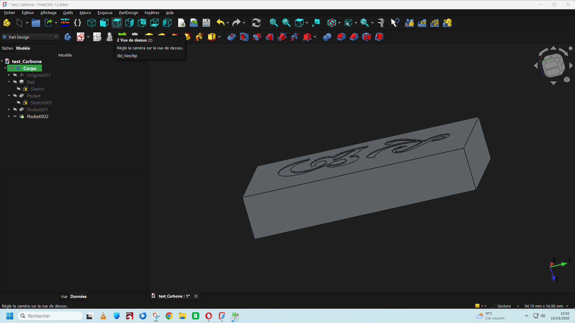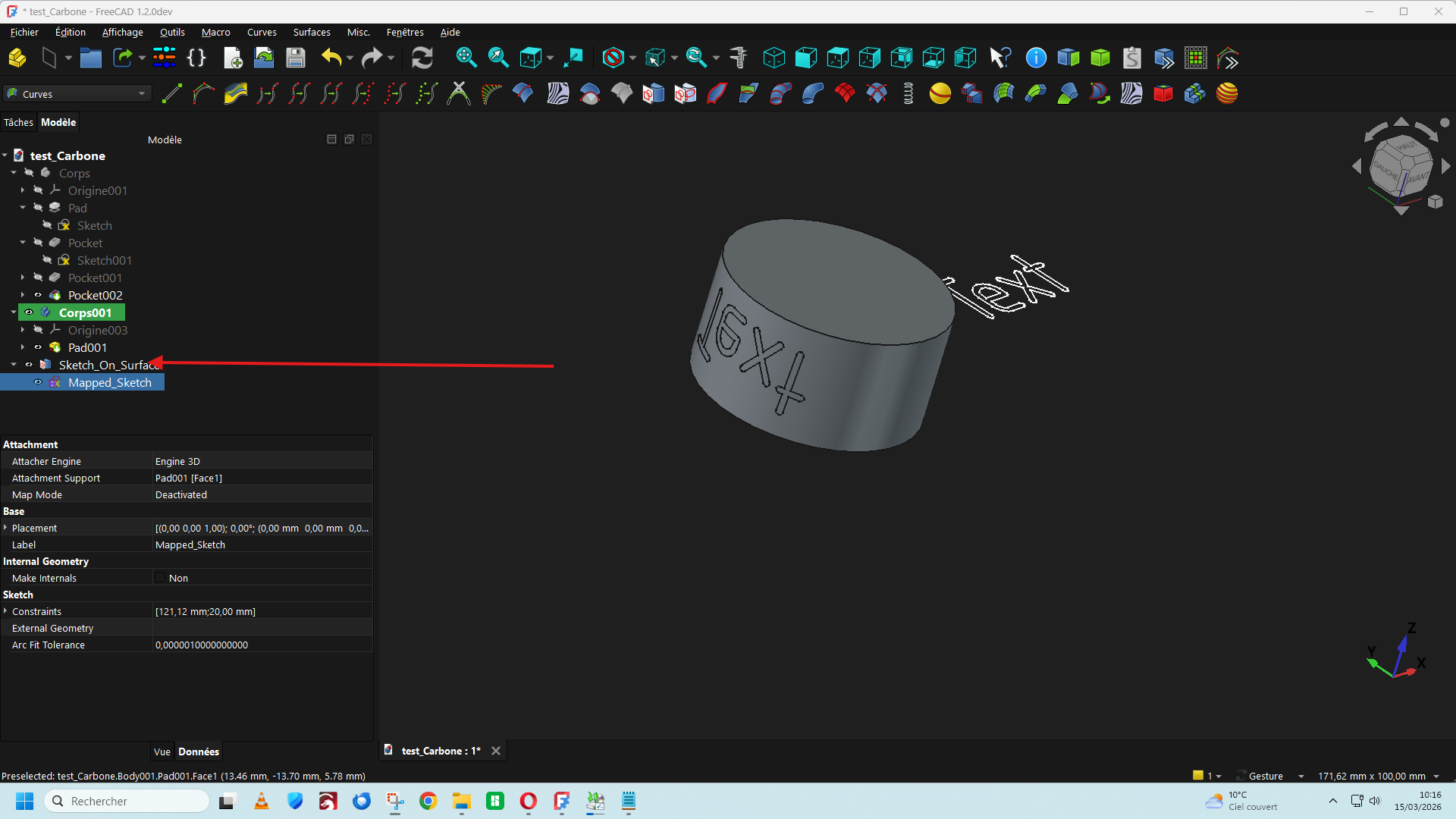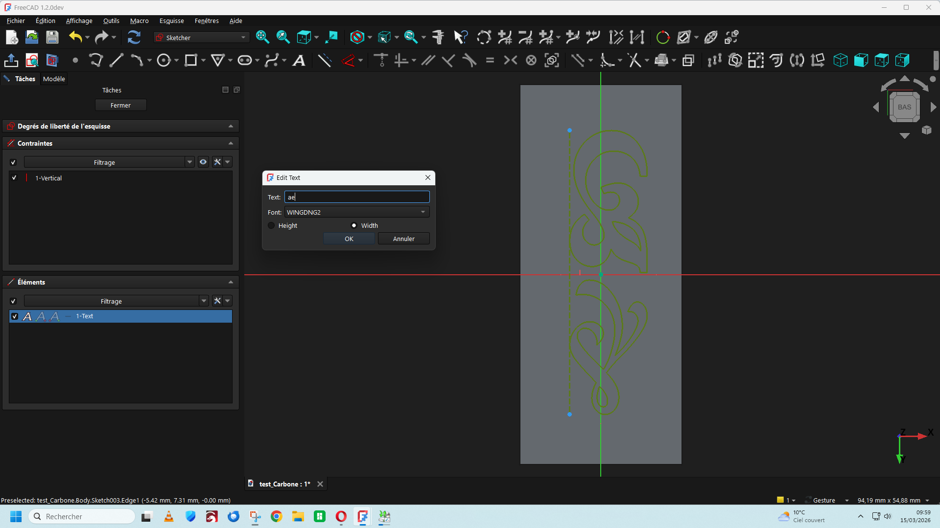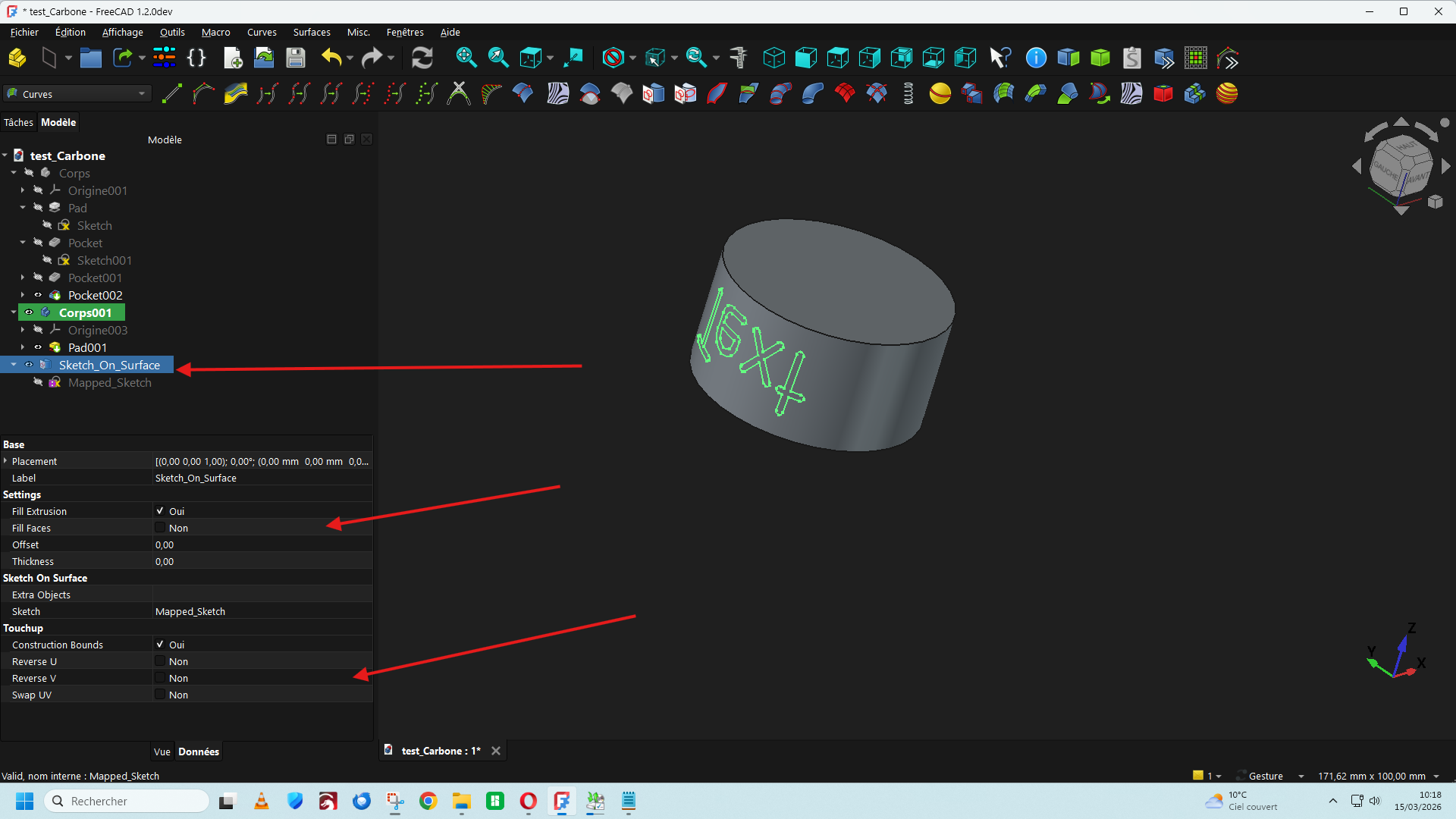 lariflette77 Posté(e) il y a 1 heure Posté(e) il y a 1 heure Bonjour, Dans la version de FreeCad 1.2 DEV du 11/03/2026 Une nouvelle fonction est apparue dans la barre de menu (A) qui permet d'insérer un texte directement ce qui facilite le travail d'insertion d'un texte ou une lettre de police de caractère stylisée sur une surface plane ou cylindrique. https://github.com/FreeCAD/FreeCAD