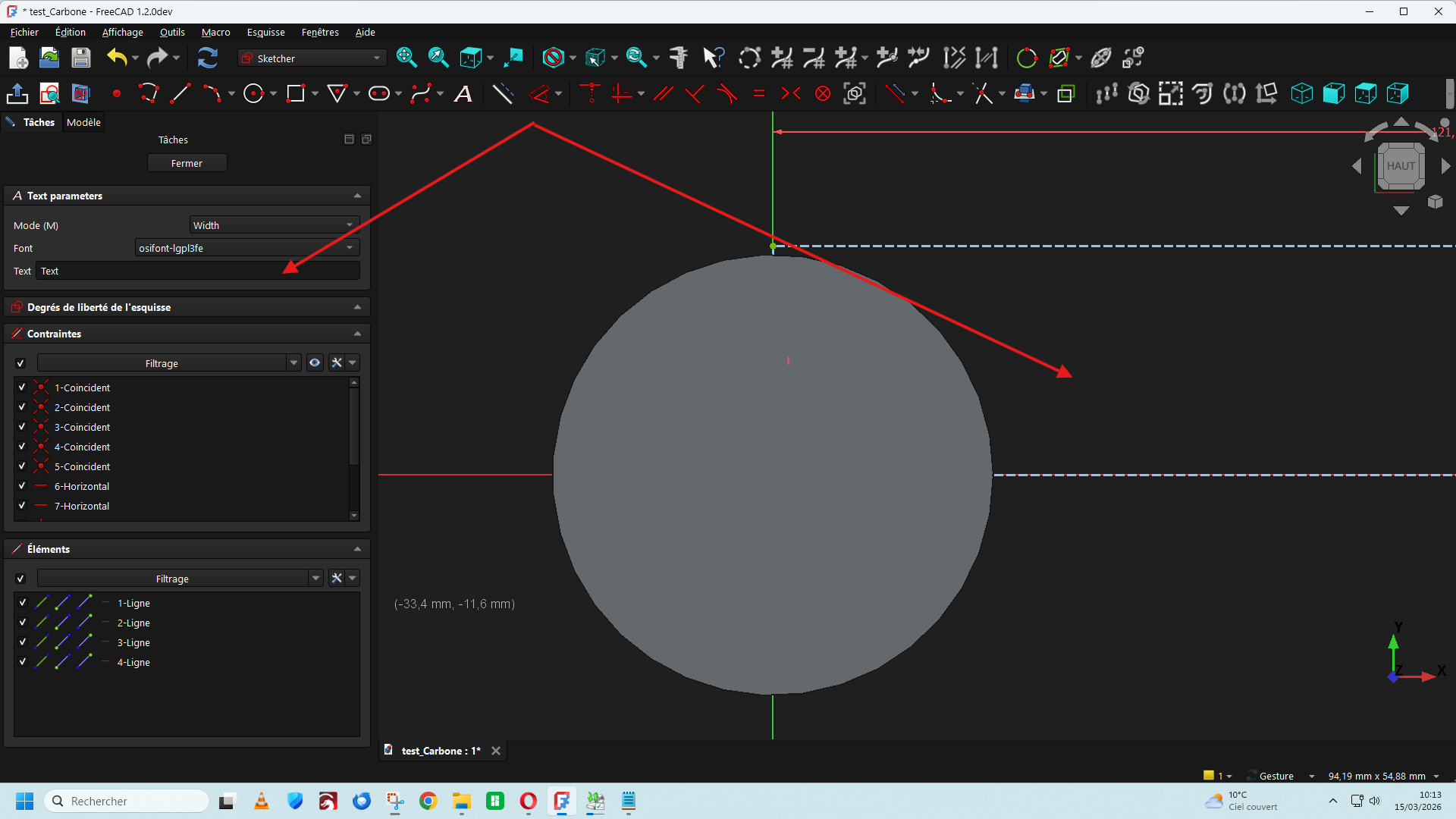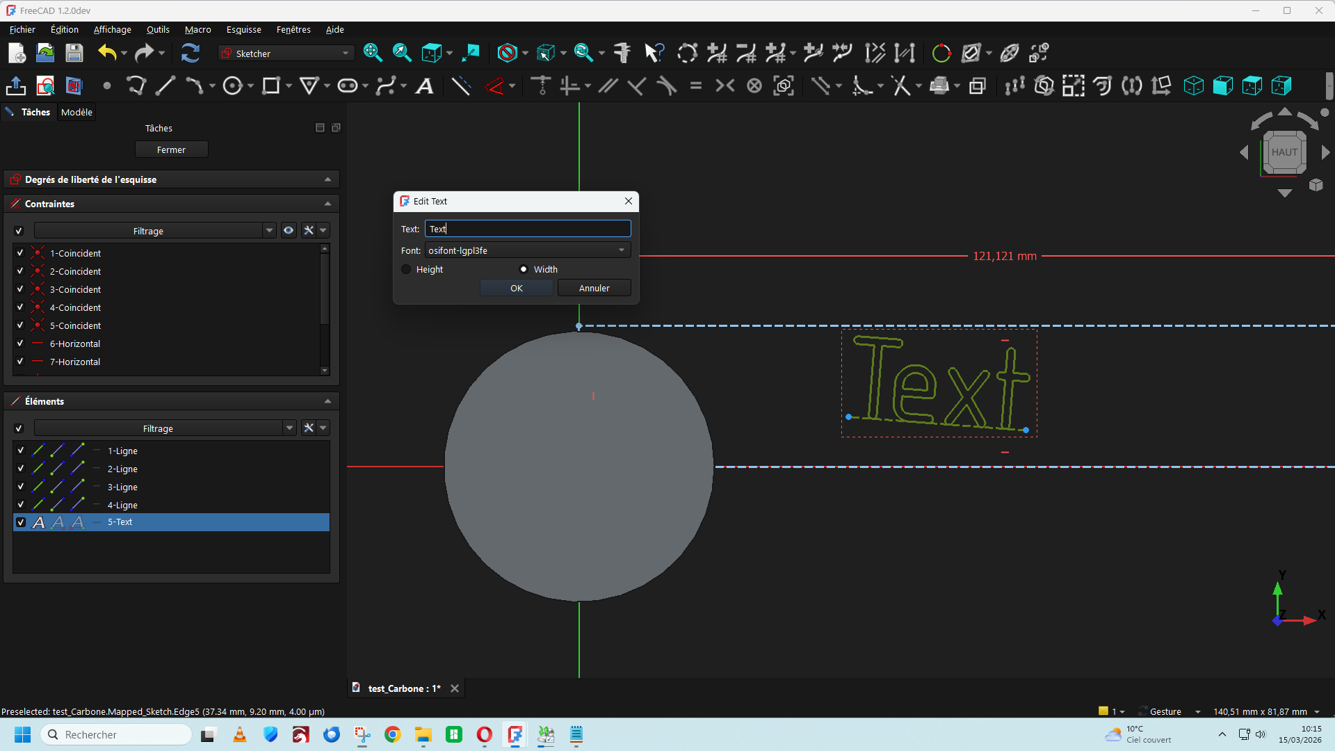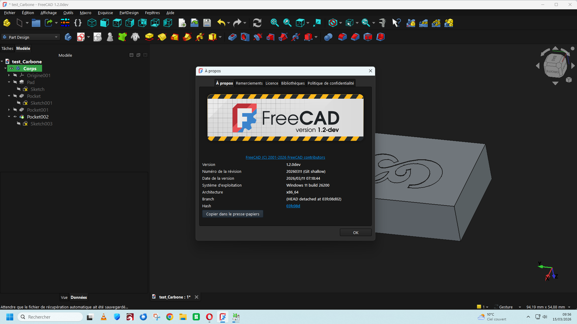 lariflette77 Posté(e) il y a 1 heure Posté(e) il y a 1 heure Bonjour, Dans la version de FreeCad 1.2 DEV du 11/03/2026 Une nouvelle fonction est apparue dans la barre de menu (A) qui permet d'insérer un texte directement ce qui facilite le travail d'insertion d'un texte ou une lettre de police de caractère stylisée sur une surface plane ou cylindrique. https://github.com/FreeCAD/FreeCAD