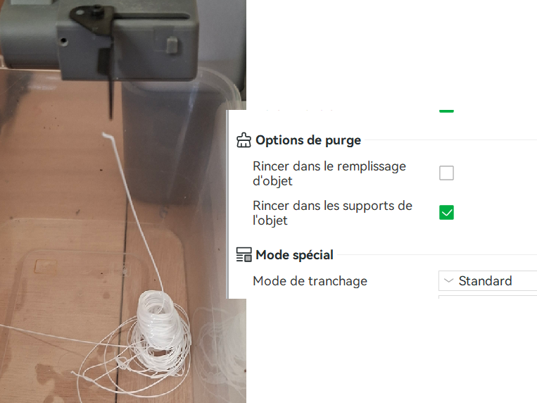 bp006 Posté(e) il y a 1 heure Posté(e) il y a 1 heure Bonjour a tous, je suis sur Bambulab A1 avec bobine externe. Comment peut on svp regler le volume de purge? Estce possible? car je ne trouve pas dans les options J'ai du déposer le petit bac sur le coté car l'accumulation de filament il ne cessait d'encrasser le bout de la buse
