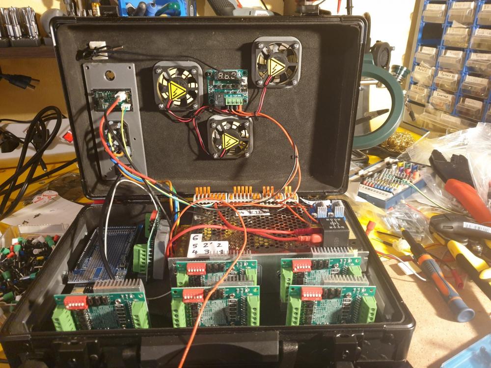 Vinchator Posté(e) Mai 28, 2019 Posté(e) Mai 28, 2019 Ces jours je suis sur l'électronique j'ai choisis de mettre le tout dans une valise qui se tiendera debout... L'alimentation se fait en 230v direct sur la valise et les câbles des moteurs sortirons par un presse étoupe puis sur une prise db37. Il reste à insérer les 7 drivers tb6560 et câbler le tout. J'ai mis un petit thermostat pour les ventilos pour le fun et un module ampermetre voltmetre pour surveiller la conso des moteurs
