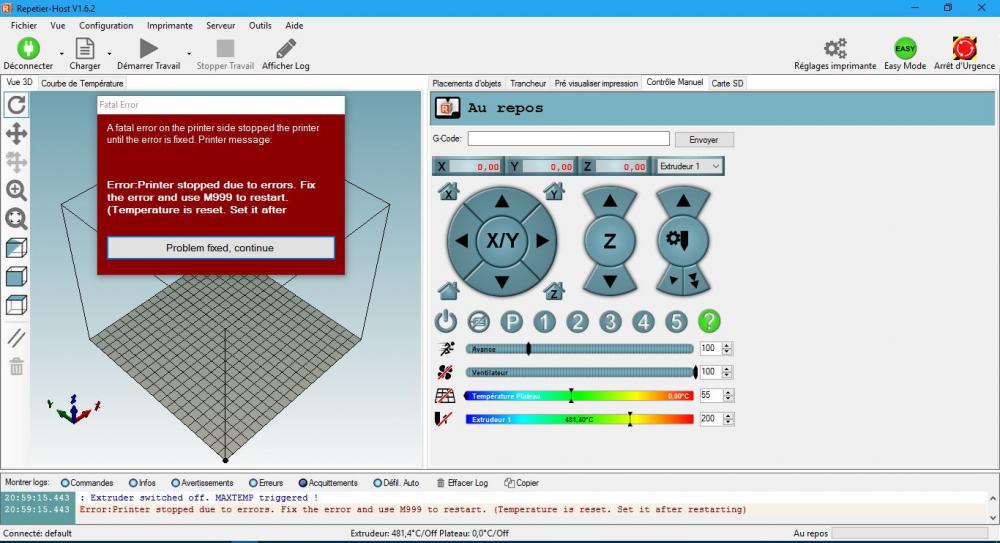 aLAnNPrint Posté(e) Mai 1, 2017 Auteur Posté(e) Mai 1, 2017 (modifié) Ha @Harleyme l'imprimante que je parle qui marche plus je ne l'ai pas acheter sur le site de @delirium07 mais sur ebay ? Sinon mon imprimante son probleme c'est que la carte mere a cramé, on l'a donc changé on a essayer de remettre un firmware (meme si on est pas sur d'avoir mit le bon) mais maintenant l'ecran de controle ne s'allume plus et quand je la connecte au pc ça marque un message d'alerte à cause "d'une buse trop chaude" (480°C, c'est la photo) ? Modifié (le) Mai 1, 2017 par aLAnNPrint