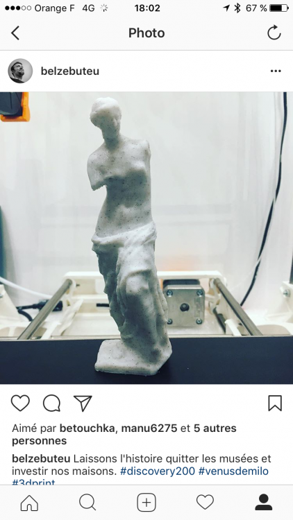 Belzebuteu Posté(e) Juin 23, 2017 Posté(e) Juin 23, 2017 Bonjour, je vends ma discovery 200 evo350 achetée neuve en septembre 2016. Je l'ai équipée de renfort pour une meilleur stabilité et d'une hauteur de 350mm de haut. Jamais eu de gros soucis (buse bouchée ,moteur). La Dagoma est une bonne petite machine pour aborder sereinement le monde de l'impression 3d. Je fournirais la nouvelle tête v3 déjà imprimée ainsi que les nouveaux ventilateurs allant avec la tête + nouveaux support de plateau et un second plateau alu neuf. Il est tout à fait possible de la remettre en configuration initiale 200x200x200. Je possède toujours la boite. En tapant mon pseudo sur la recherche du forum, vous trouverez quelques exemples fait avec l'imprimante. Quelques exemples d'impression. Disponible à Villefranche sur Saône (69400 Rhône). Prix: 200€