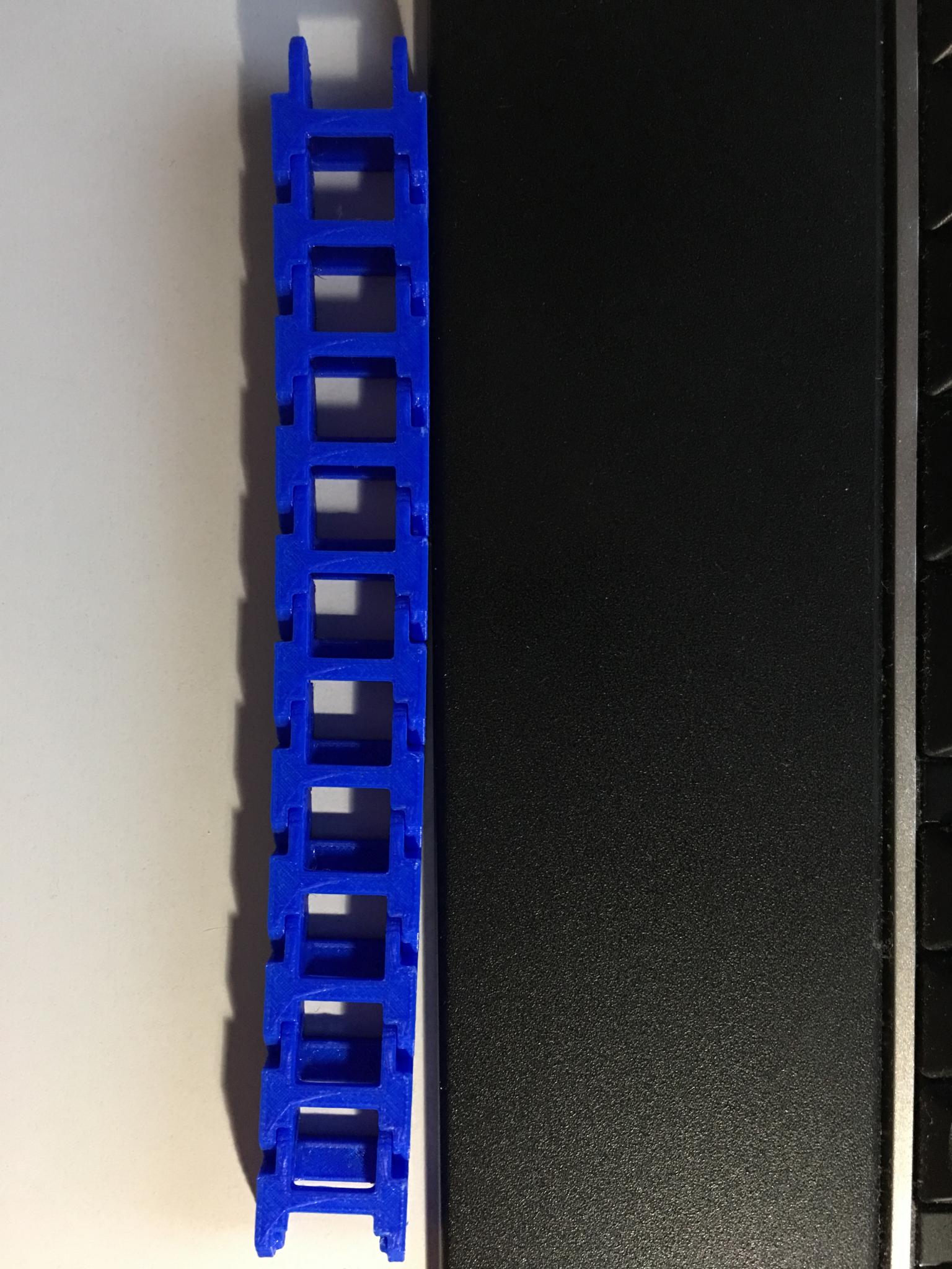 A priori, le problème est connu, tiré de la description du STL en question: Uploaded a version with four links arranged in different directions. For an unknown reason, when the links are assembled in a long chain they tend to curve in an arc. Printing with them arranged in different directions so that the error cancels itself out seems to fix the problem.
