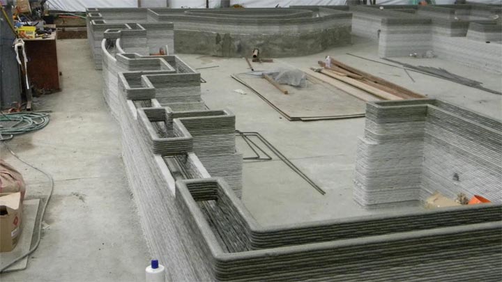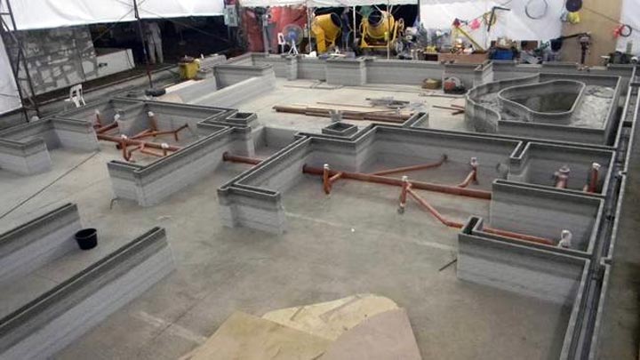 La construction en 3D a nécessité une centaine d’heures d’impression, entrecoupées de pauses pour installer le câblage électrique, les tuyaux de plomberie et la ferraille pour consolider l’architecture.