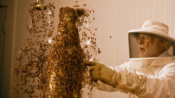 Ce ne sont pas moins de 80 000 abeilles ouvrières qui ont été enfermées dans des cloches afin qu’elles y développent des essaims qui épousent leurs formes. Une fois les moules retirés et les abeilles évacuées, on obtient de véritables œuvres d’art en miel comme une ruche en forme de bouteille géante de whisky Honey Highlander.