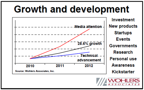 On remarque que la croissance de ce marché, supérieure à 25%, fait de l’impression 3D l’un des secteurs les plus innovants en 2012 avec environ 960 brevets déposés rien qu’aux Etats-Unis. Cette croissance commence à attirer de plus en plus de grands acteurs industriels, on pense naturellement à l’arrivée de Apple et de HP sur ce marché qui tend à s’ouvrir et à atteindre les particuliers.