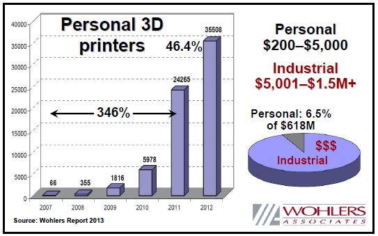 Grâce à des démarches telles que celles instituées par RepRap, à la diminution globale des prix et au développement du circuit de distribution, l’impression 3D personnelle tend à devenir une réalité. En s’appuyant sur le rapport de Whollers Associates 2013, on constate qu’au cours des cinq dernières années, le nombre d’imprimantes 3D personnelles vendues est passé de 66 en 2007 à 35 508 en 2012. Rien que de 2011 à 2012, le nombre de ventes a augmenté de 46% et le nombre d’acteurs ne cesse de croître sur un marché qui devrait peser plus de 3,1 milliards de dollars en 2016 selon Forbes.