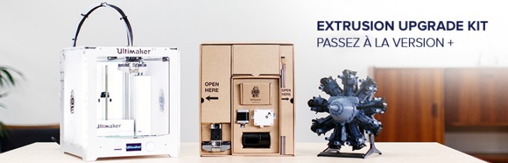 Il est aujourd’hui possible de faire évoluer son imprimante 3D open source Ultimaker 2 vers Ultimaker 2+ et Ultimaker 2 Extended vers Ultimaker 2 Extended+ grâce à la commercialisation d’un kit upgrade composé d’une dizaine de pièces : nouvelle tête d’impression, quatre formats de buses interchangeables (0.25, 0.4, 0.6 et 0.8mm), moteur et feeder de remplacement, carte de calibration du plateau et même les autocollants pour afficher le modèle “+” sur l’imprimante.