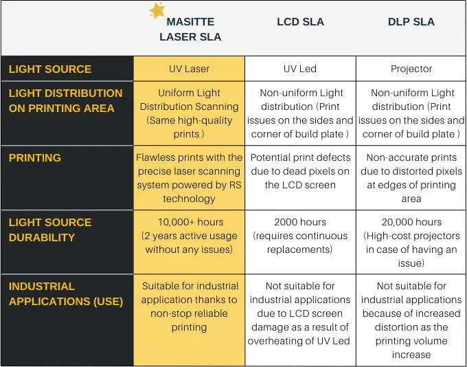 Comme on le voit ci-dessous, la technologie Laser SLA est très différente du DLP ou du MSLA, plus connu grâce aux imprimantes 3D à stéréolithographie plus accessibles en termes de tarif et de fonctionnalités.