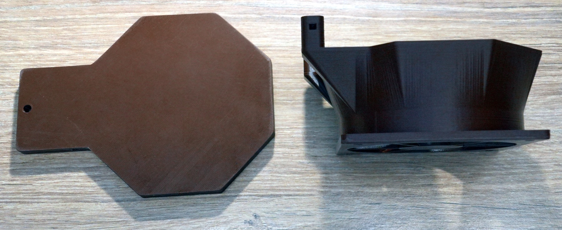 J’ai constaté une perte de chaleur au niveau du ventilateur d’extraction. J’ai apporté une amélioration à l’imprimante, en modélisant un redresseur avec une trappe pour le ventilateur d’extraction servant au refroidissement de l’enceinte. Le morceau de filtre de hotte a été retiré. En revanche, j’ai laissé le filtre de hotte sur le ventilateur d’entrée d’air.