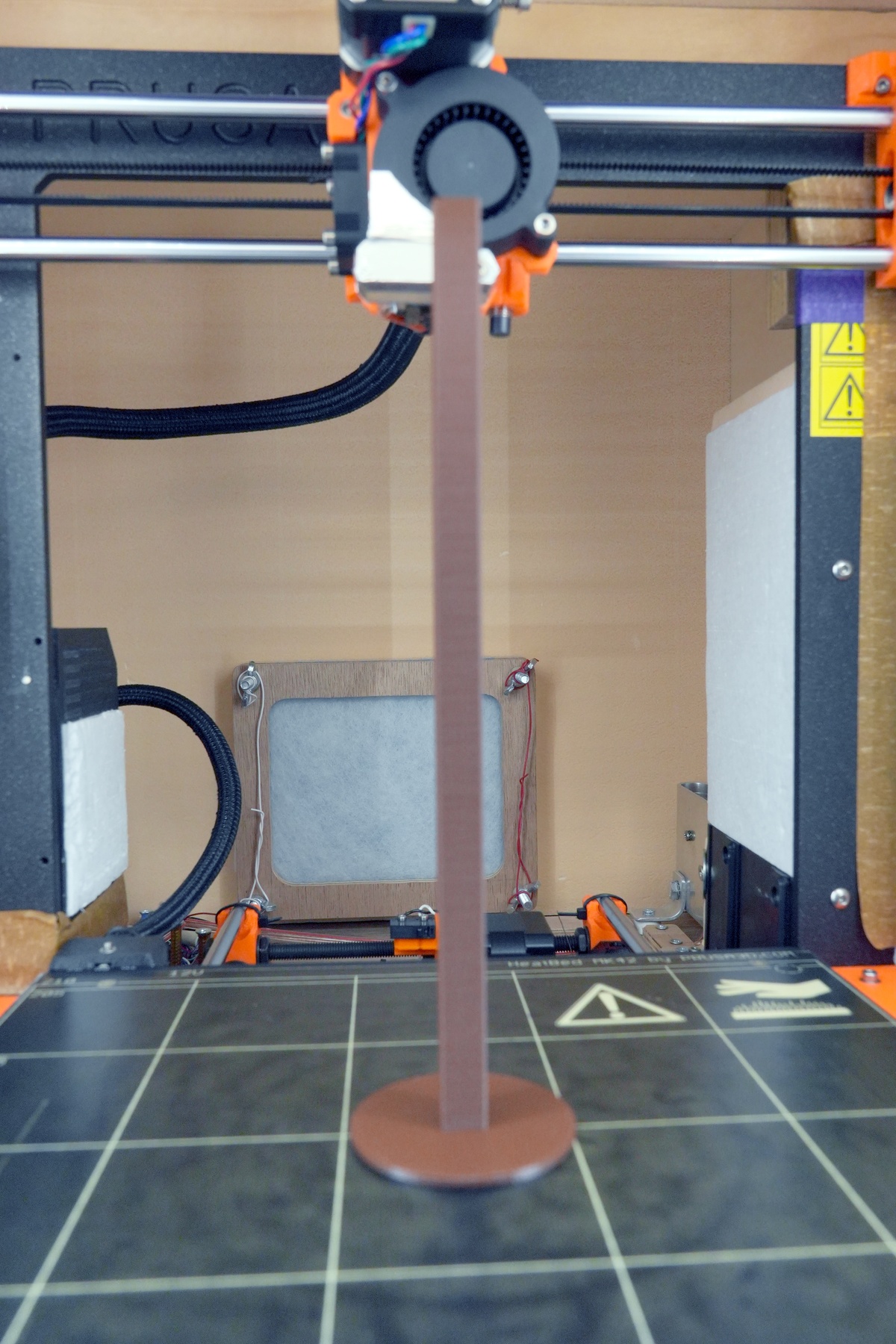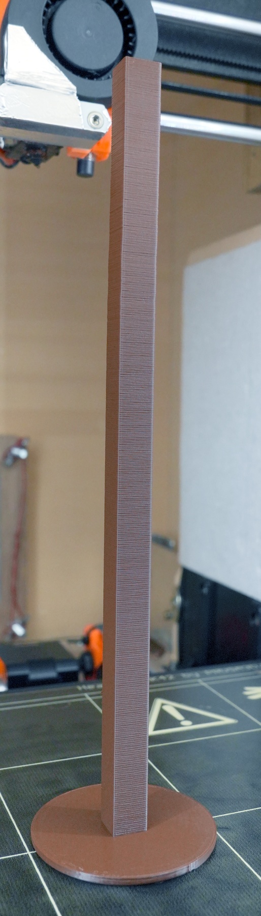 D’abord, la pièce test “Z Max”, dont la hauteur a été augmentée à 200mm (la hauteur maximale de la MK2s). J’ai aussi élargit la base. L’impression est assez lente (2h26), il y a à chaque couche une secousse avec un mouvement selon l’axe X (une telle secousse liée à un mouvement selon l’axe Y aurait fait fléchir la pièce) :