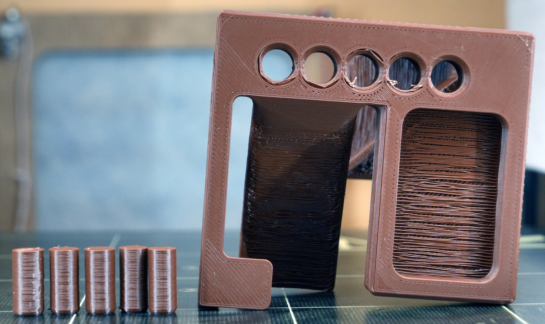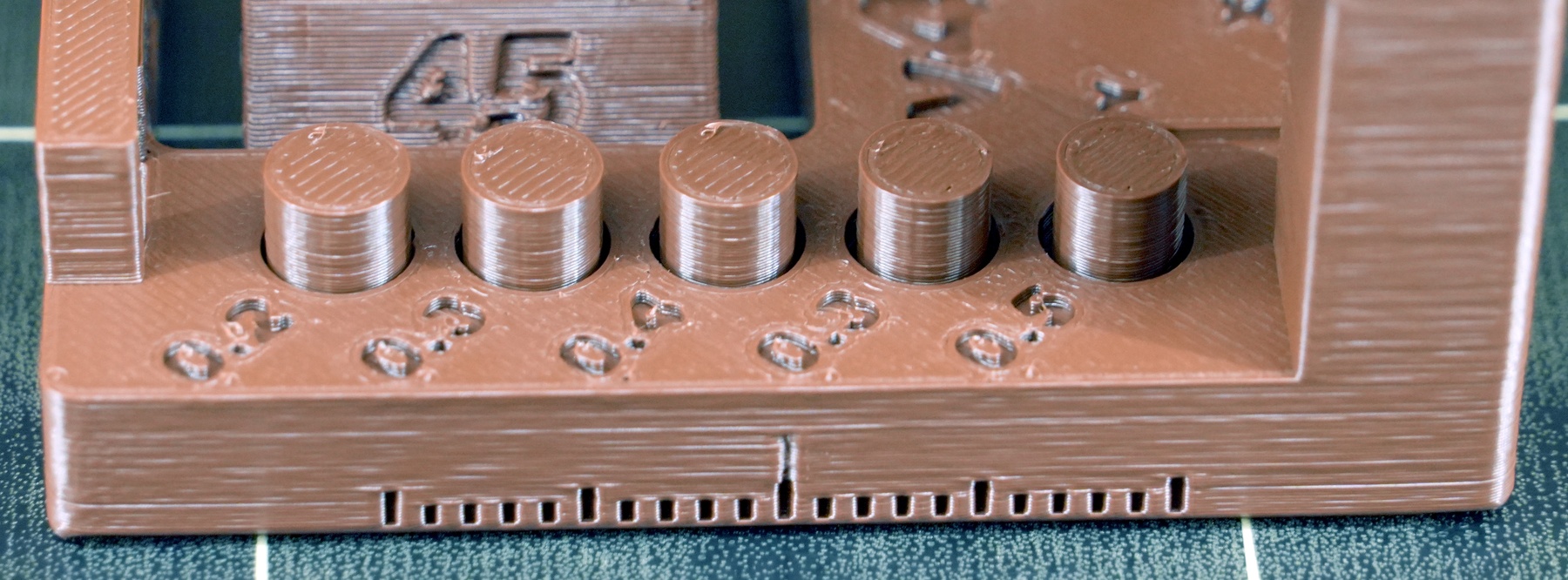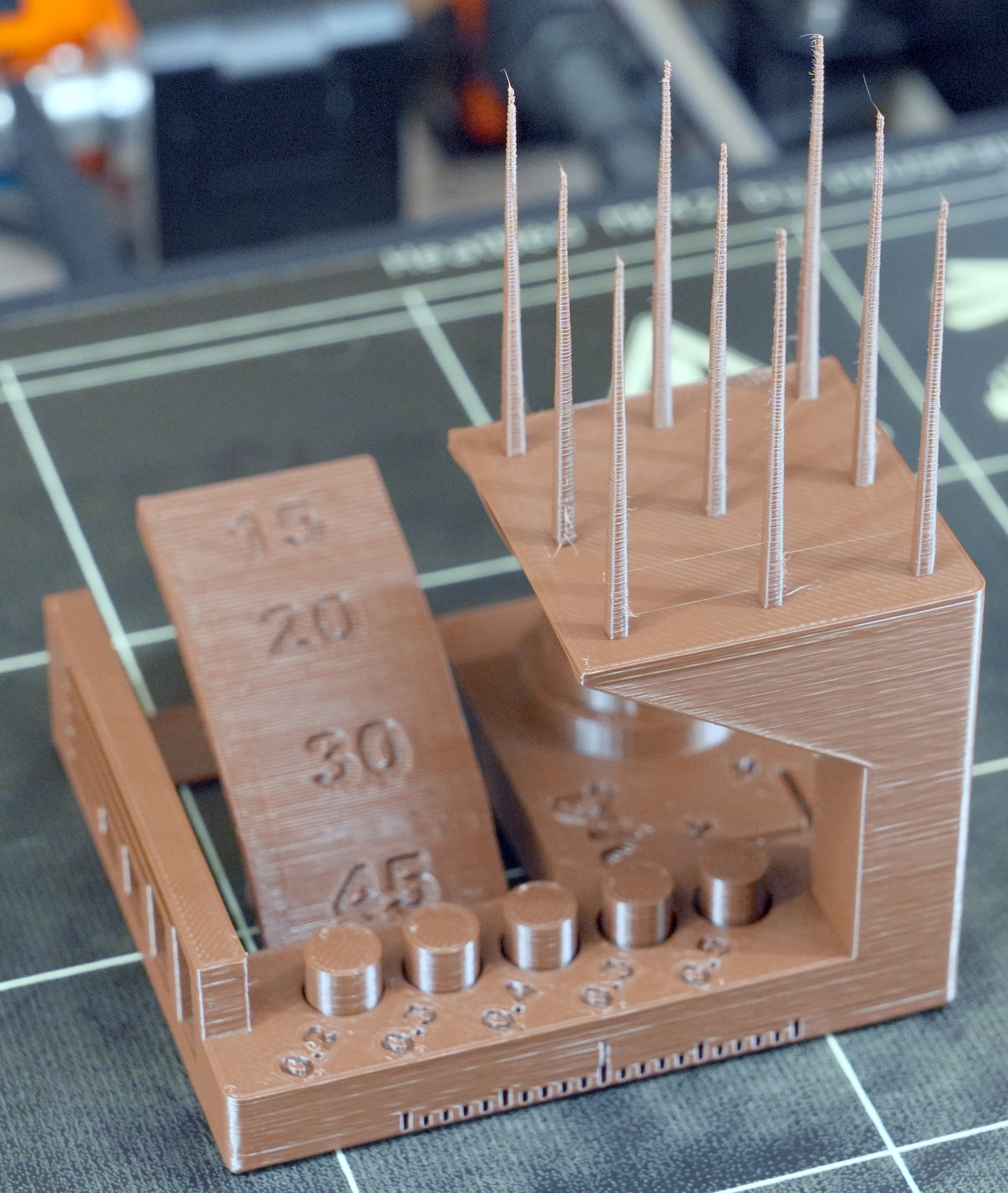 Passons à des pièces plus difficiles. Voyons comment ma MK2s de 2017 s’en sort par rapport aux imprimantes actuelles. J’ai encore augmenté la difficulté en imprimant ces pièces en ABS, en caisson chauffé.