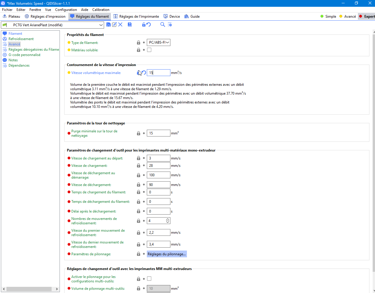 Je n’avais encore jamais imprimé de PCTG et je n’ai pas trouvé de profil spécifique pour ce matériau dans le slicer de Qidi Tech (il s’agit bien de PCTG et non pas de PETG). Je suis donc parti sur un profil “PC/ABS FR” et j’ai fait deux tests pour déterminer la “Vitesse volumétrique maximale” (MVS) pour une température d’impression donnée de 260°C (milieu de la fourchette préconisé par le fabricant 250-270°C, plateau 85°C).