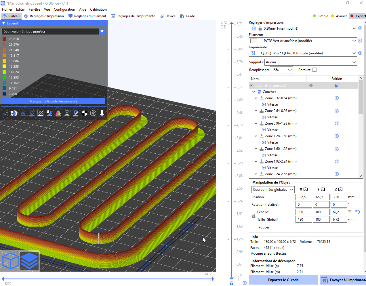 Dans un premier temps, j’ai décidé d’utiliser une “Vitesse volumétrique maximale” (MVS) de 20 mm³/s pour ce test Qidi Q1 Pro avec du filament PCTG.