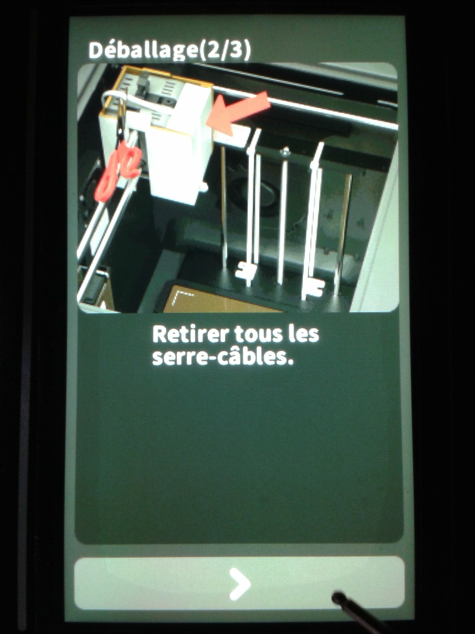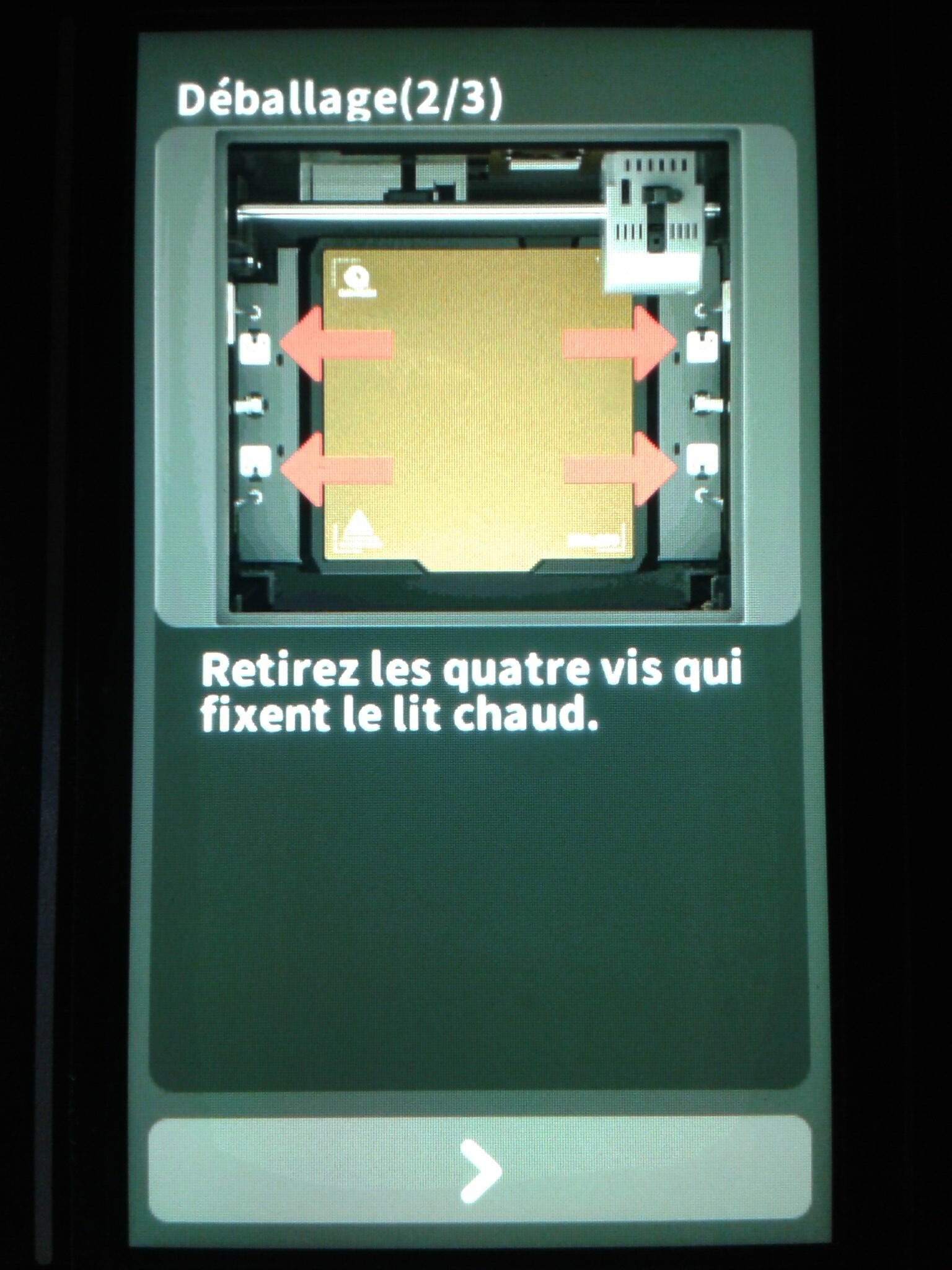 Certaines étapes de “déballage” (enlever les colliers Collson qui bloquent le Core XY et la tête d’impression, ainsi que retirer les vis qui sécurisent le plateau lors du transport.) étant détaillées et guidées sur l’écran tactile lors du premier allumage de la machine, je les ai mises dans la partie “Mise en fonction”.