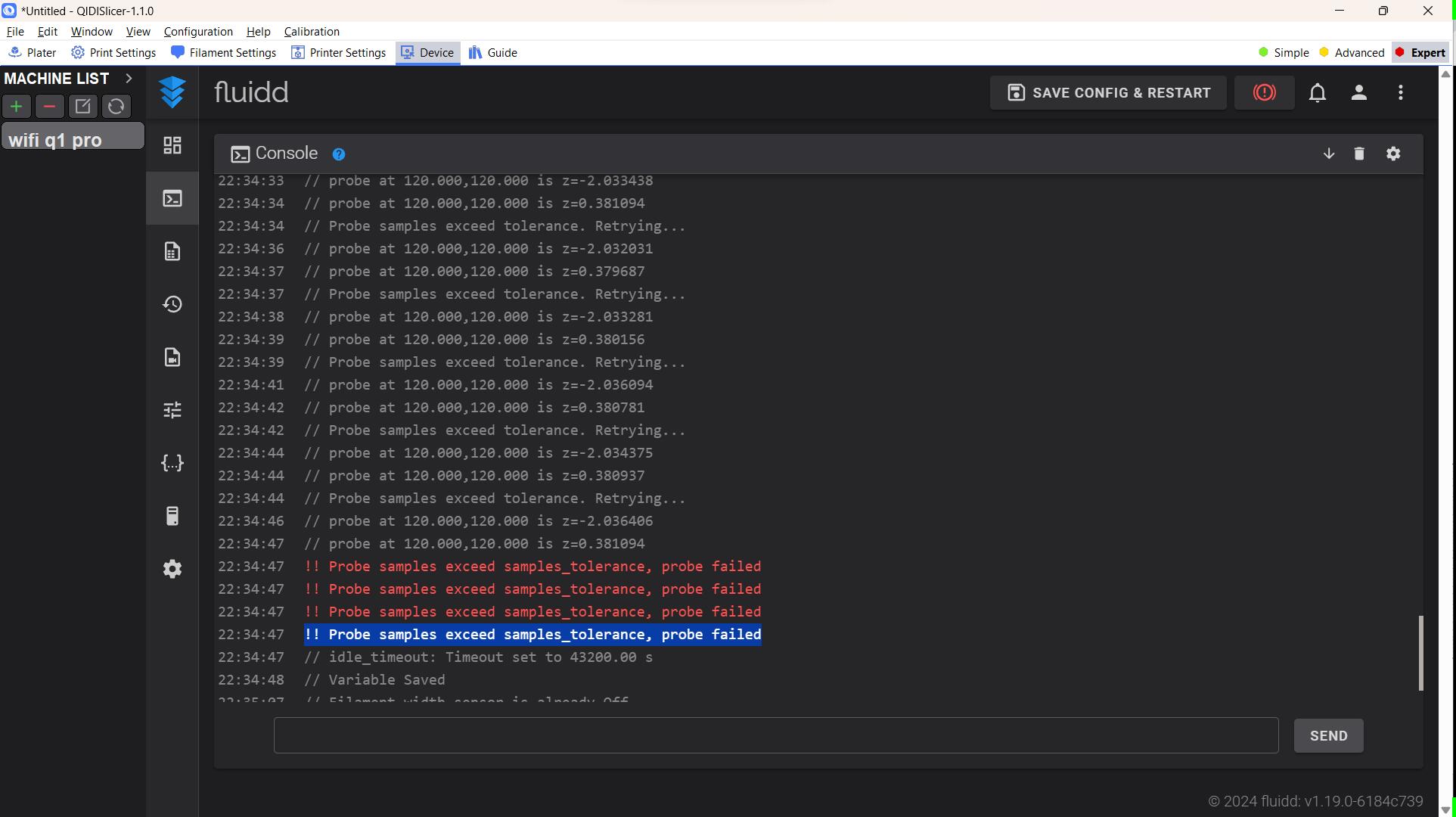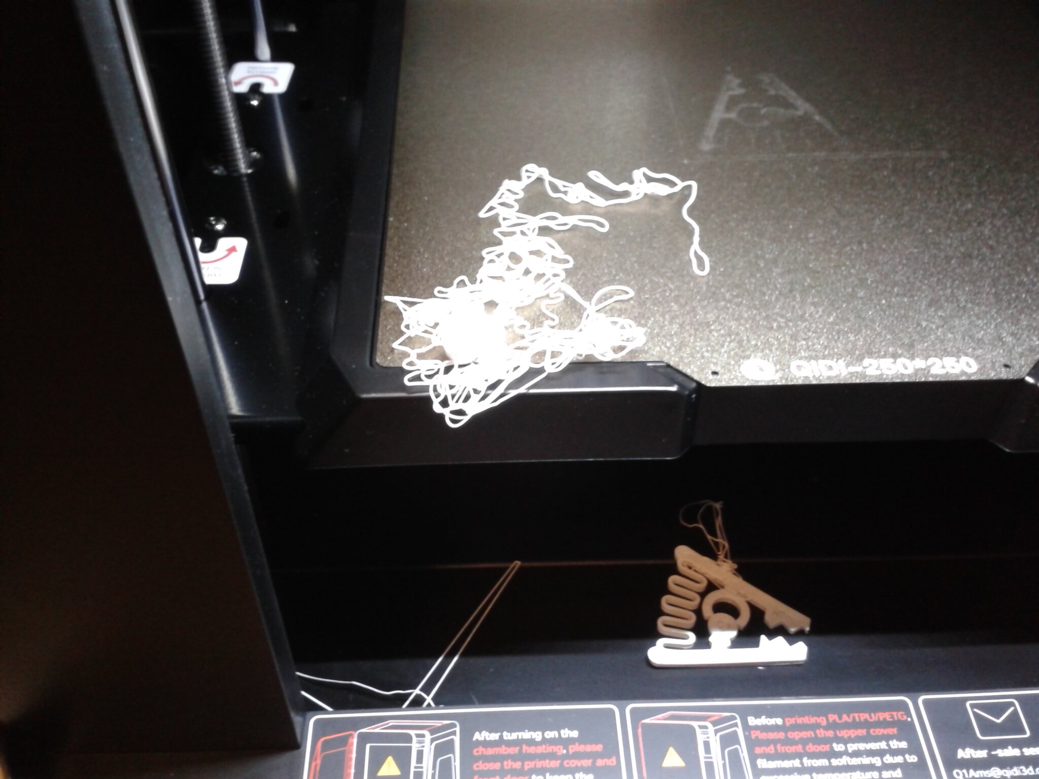 Globalement, la mise en fonction, l’utilisation et la surveillance de cette machine est rapide et relativement facile à effectuer mais il faut souvent s’y reprendre à plusieurs fois pour correctement replacer la plaque flexible magnétique sur sa base aimantée, sans qu’elle ne chevauche une partie de la coque légèrement plus haute que le plateau. On trouve, sur la page de la Q1 Pro du Wiki de Qidi Tech, une page qui parle dans les messages d’erreur de l’erreur “!!Probe samples exceed samples_tolerance, probe failed” si on ne replace pas bien le plateau.