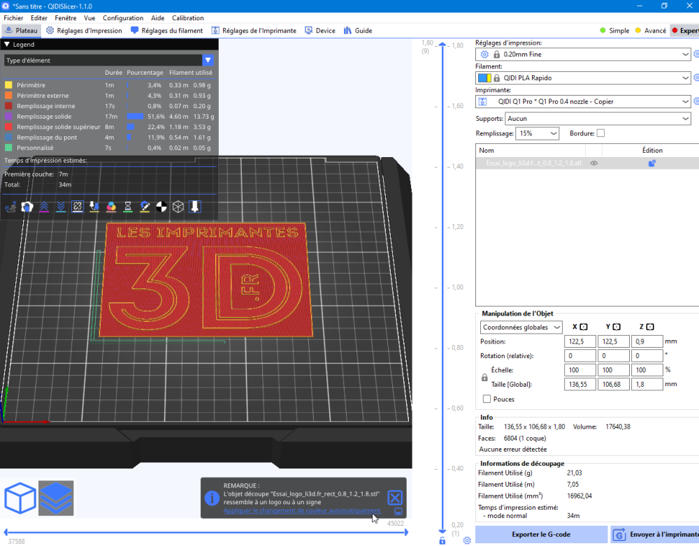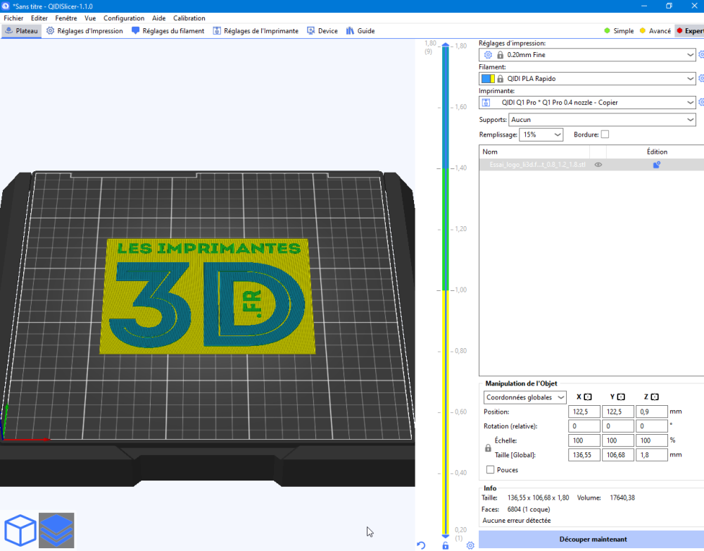 | Trancheur | Qidi Slicer (et autres trancheurs comme Ultimaker Cura, Simplify3D, PrusaSlicer, Orca…) |