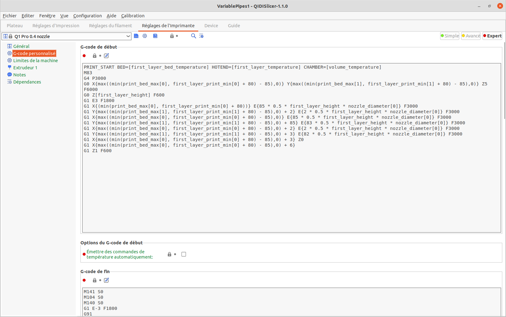 QidiSlicer v1.1.0, “0.20 mm Fine”, “Generic ABS” Modifié (Buse 240°C, Plateau 100°C, Chambre 50°C, Vitesse volumétrique maximale 11 mm³/s)