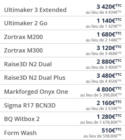 Pour avoir à déménager moins de cartons, le revendeur français Makershop propose des imprimantes 3D reconditionnées à des prix intéressants. Du matériel d’occasion mais dont la garantie est de six mois. On y retrouve l’imprimante Ultimaker 3 Extended, l’UM2 Go, les Zortrax M200 et M300, la Raise3D N2 Dual et la Dual Plus, une Markforged Onyx One, la machine espagnole BQ Witbox 2 et une Sigma R17 BCN3D. Retrouvez ces imprimantes 3D reconditionnées sur le site Makershop.