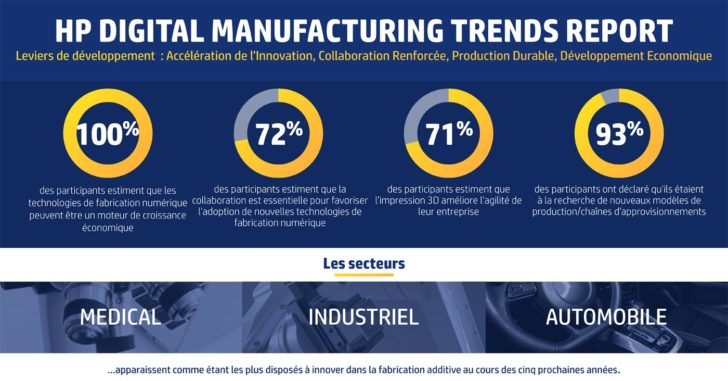 C’est durant son Innovation Summit que le géant américain HP a réalisé un sondage auprès des experts et clients qui ont participé à l’événement. Les chiffres sont exposés sur l’infographie ci-dessous, il ne fait aucun doute que tendances de la fabrication numérique, où l’impression 3D industrielle occupe une place de choix, est au coeur de tous les investissements à venir. Parmi les participants à l’étude HP Digital Manufacturing Report, on peut citer Decathlon, Nissan, le Forum Economique Mondial, Additive Integrity, Forecast3D, IDC, Solize et les représentants de plus de deux mille autres entreprises réparties dans le monde entier (France, Canada, Chine, Allemagne, Japon, Mexique, Singapour, Royaume-Uni et États-Unis).