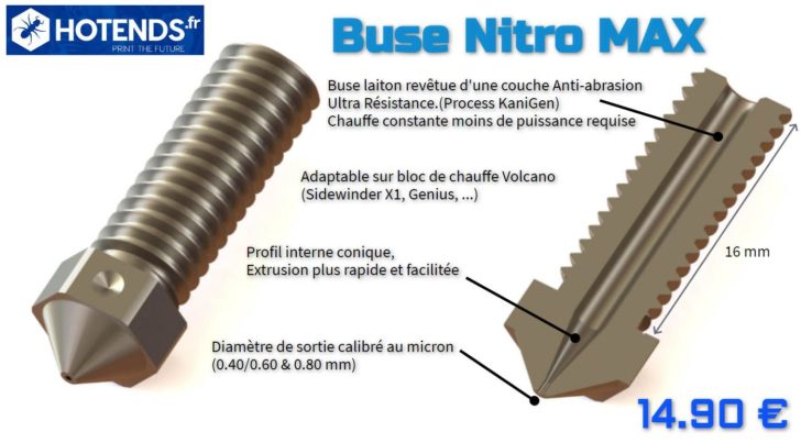 La buse Nitro de Hotends.fr est sur le marché depuis quelques temps déjà. Cependant, elle n’est compatible qu’avec les corps de chauffe de type V6 (à filetage court). Mais pour répondre au succès des imprimantes 3D Artillery (et autres machines avec un heat block de type Volcano), la boutique française va proposer la buse Nitro Max. Il s’agit d’une buse en laiton qui offre de très bonnes performances thermiques mais aussi une très bonne résistance à l’abrasion grâce à un revêtement spécifique. Proposée à seulement 14,90€, c’est une très bonne alternative Made in France à la buse Nozzle X.