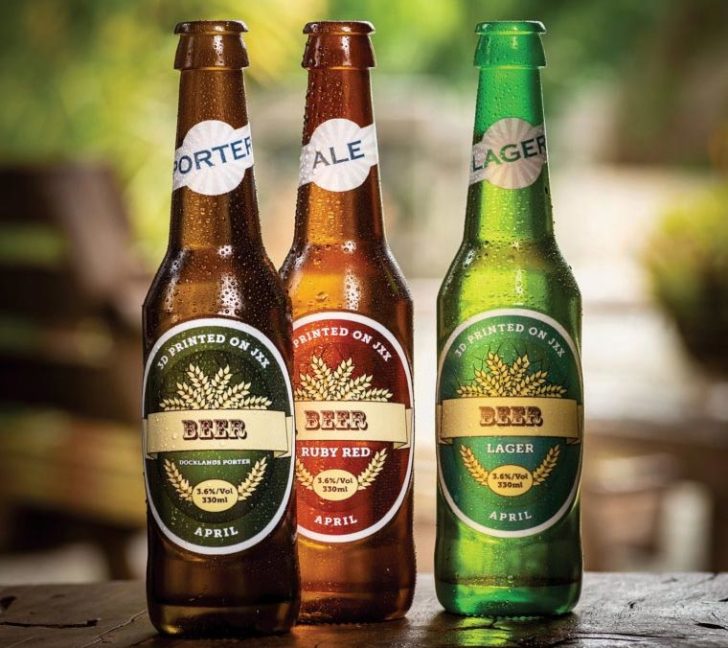 C’est avec trois bouteilles de bière que Stratasys nous vante les qualités de ses imprimantes 3D couleurs et multi-matériaux de la gamme PolyJet. Ces réalisations ne sont pas prêtes à remplacer les usines d’encapsulage mais le réalisme des matériaux VeroUltra et les couleurs certifiées Pantone garantissent un excellent résultat. A s’y méprendre sur ces fausses bouteilles de bière !