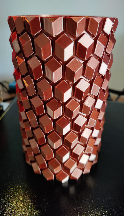 Vu sur le groupe Facebook BIQU BX User Group, ce vase imprimé avec du filament Noulei Silk Copper fondu à 200°C sur un lit à 60°C offre un visuel assez déstabilisant à l’œil, proche de l’illusion d’optique. En effet, il laisse penser qu’il est constitué de plein de petits cubes alors qu’il n’y en a que des faces en 3D. Les plus anciens gamers diront surement que ça les fait penser à une tour de Mario tandis que les plus jeunes feront sûrement allusion à un ananas de Minecraft. Quoi qu’il en soit, si vous voulez imprimer ce vase décoratif, vous pouvez télécharger le STL gratuitement sur Thingiverse sans oublier de partager le résultat dans la galerie photo du forum.