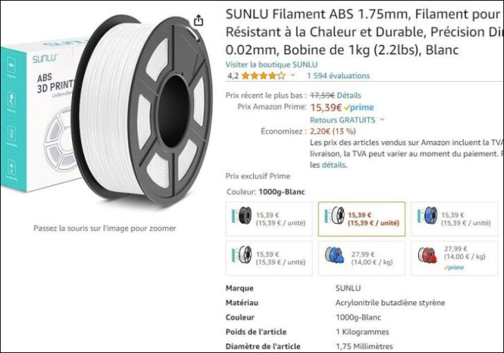 Les abonnés Amazon Prime peuvent profiter d’une offre sur de l’ABS Sunlu qui passe à 15,39 € la bobine de 1 kg. Différents coloris sont disponibles (blanc, noir, rouge, bleu…).