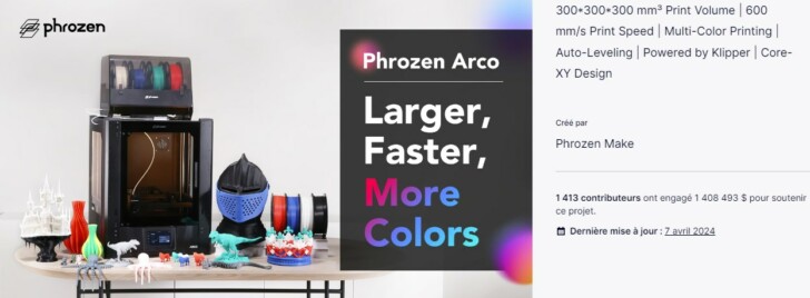 Phrozen y va aussi de son boitier AMS multi-couleurs mais celui-ci est déjà annoncé depuis plusieurs mois et déjà aperçu dans certains salons (Formnext 2023, par exemple). Il est associé à l’imprimante 3D Phrozen Arco dont la campagne de financement participatif sur Kickstarter vient tout juste de prendre fin, engageant plus de 1 300 000 € grâce à plus de 1 400 “backers” enthousiastes. On en parle aussi sur le forum.